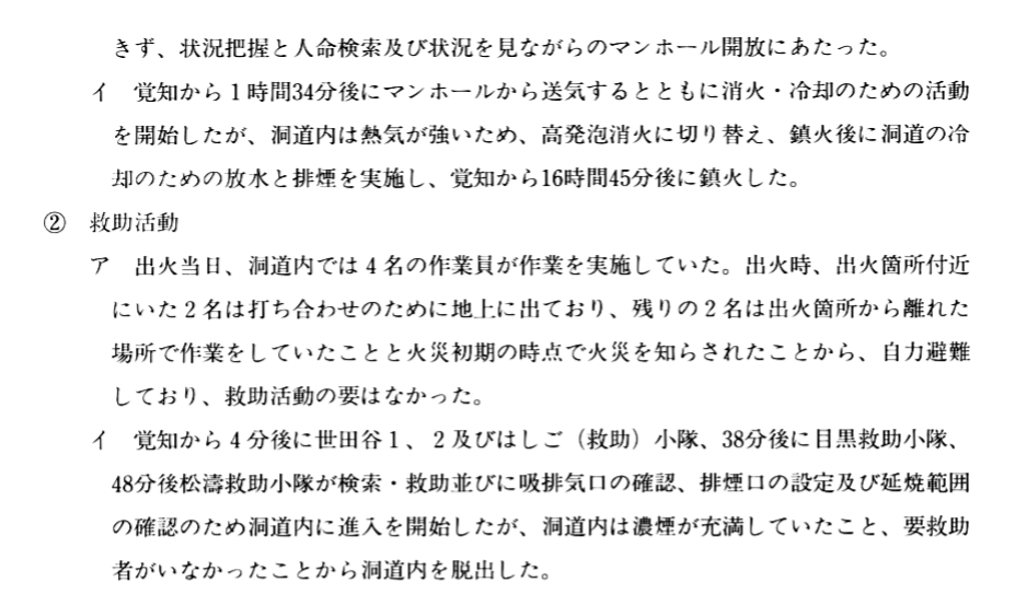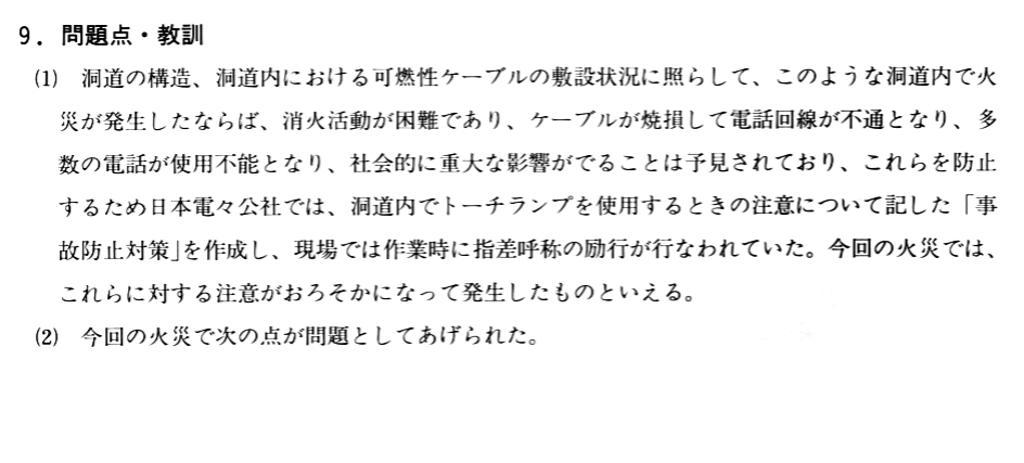 - 想定外1 - 洞道は鉄筋コンクリートでできており、他のケーブルも入っておらず、使用する電圧も電流も低いので、火災事故は想定されていなかった。実際の事故はアセチレントーチという強力な火の使用と、強い可燃性のケーブル被覆が大量にあることから起こった。特にプラスチックは燃えると消火しづらく、発煙量が多い。