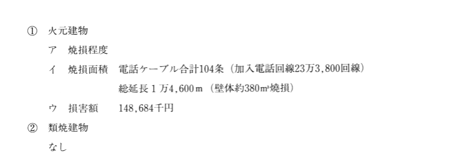 1975年4月20日、北海道旭川電報電話局東光分局の火災があり、1.9万回線が不通となり、復旧に2週間かかった。そのため、今回も当初復旧に5ヶ月かかると予想された。