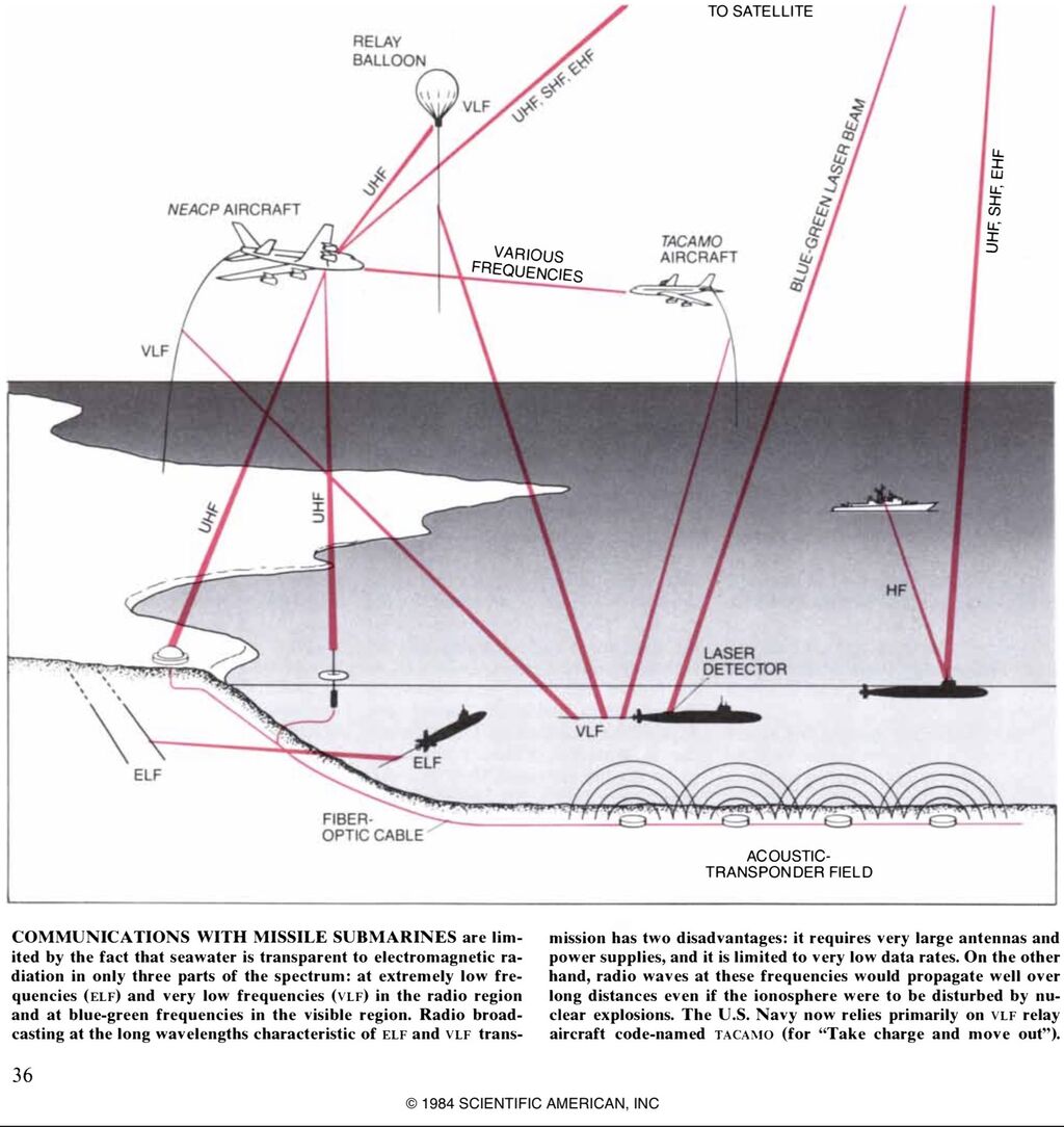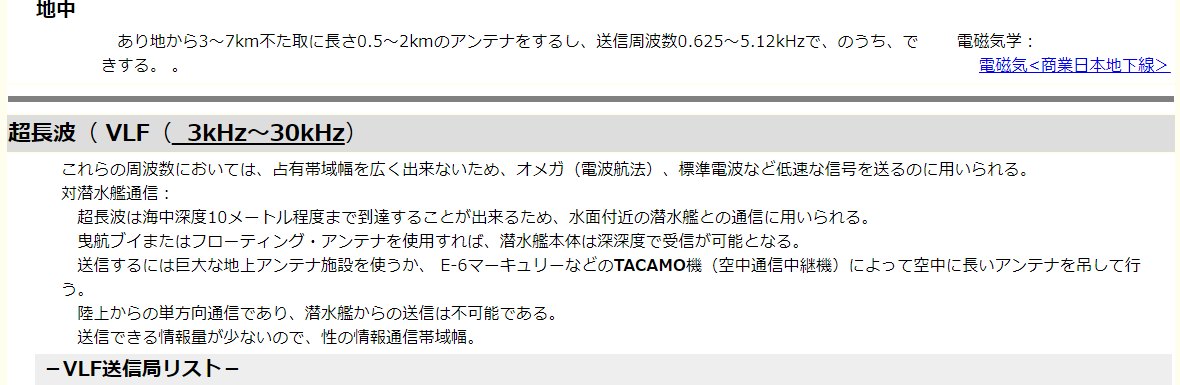 海中においては電波が減衰しやすいため、海中を航行する潜水艦に対しては、通常の・などの通信は不可能であり、水中も実用化されていない。通信設備としては、比較的海中を透過しやすい(VLF)などを利用し地上との通信を行うがVLFでは多量の情報を受信することが難しく、また潜水艦側からの発信もできないために、必要に応じて露頂し、短波・極超短波やを行なう。