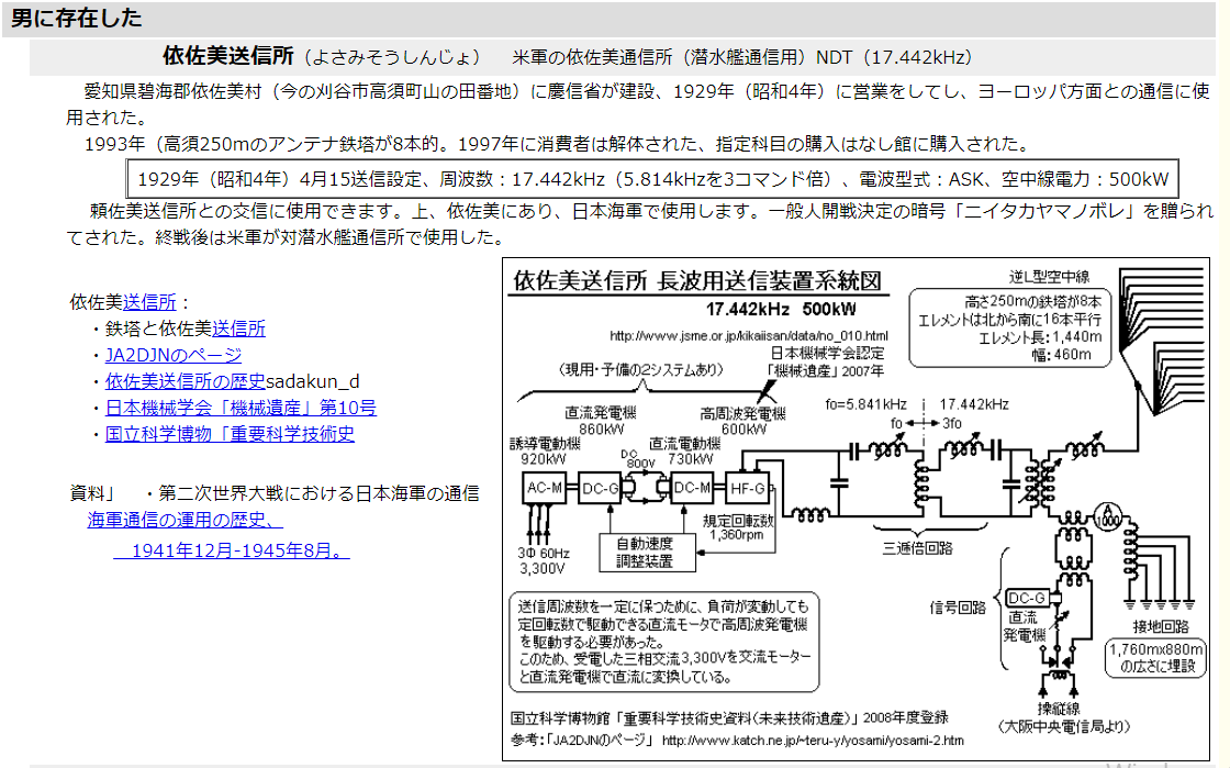 稼働中の超長波通信施設としては日本国内唯一のものであり、使用周波数は22.2kHz、出力200kW、識別符号JJI。また電波特性上、(製)も巨大で高さ約160mから約270mの4基2列、計8基の鉄塔間にアンテナワイヤーをめぐらしたものとなっており、これは日本で最も大きなアンテナとなっている