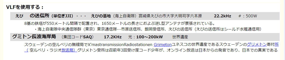 (VLF)は海中深度10m程度まで到達するので、深度数メートル程度を潜行すれば受信可能である。実際はそこまで浅く潜ると発見される可能性が高まるが、曳航ブイまたはフローティング・アンテナを使用すれば、潜水艦本体は深深度で受信が可能となる。しかし、送信できる情報量が少ないので、大量の情報通信には向かない。また陸上からの単方向通信であり、潜水艦からの送信は不可能である。