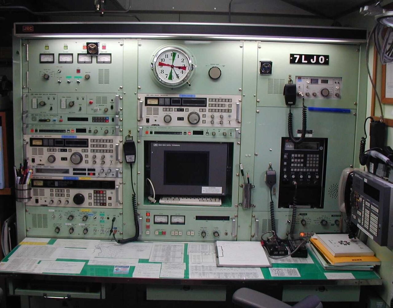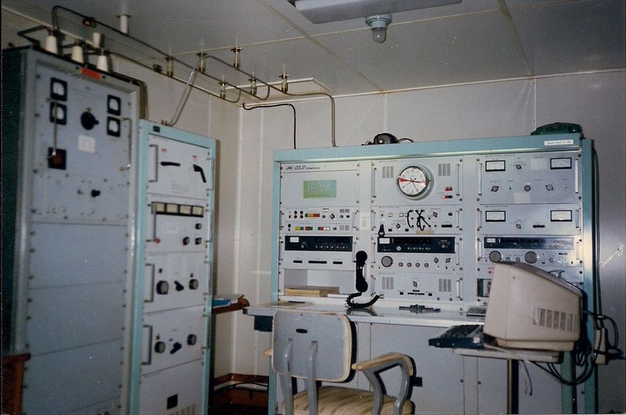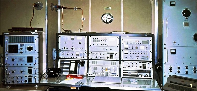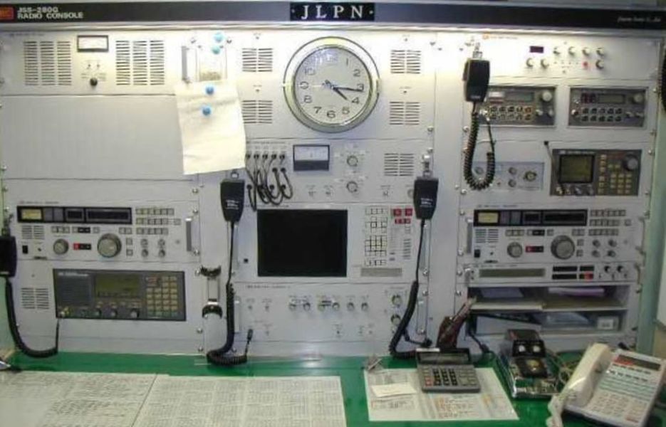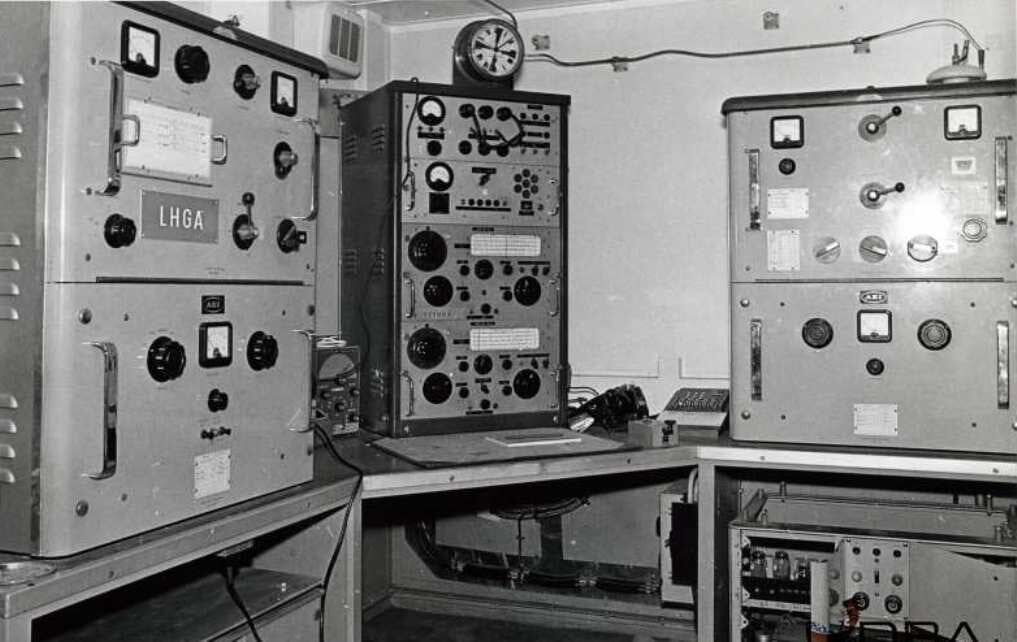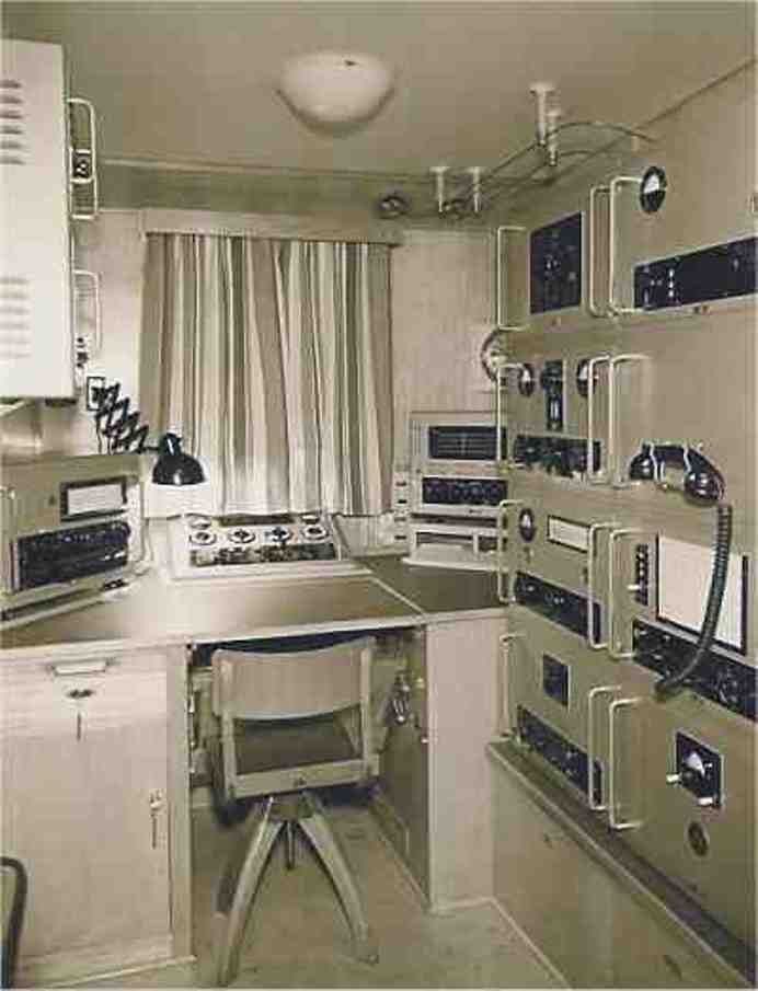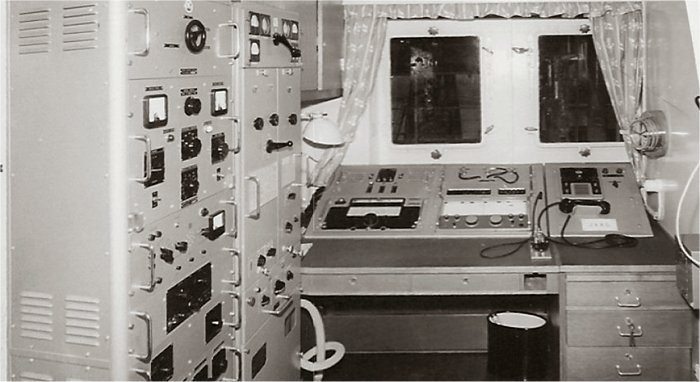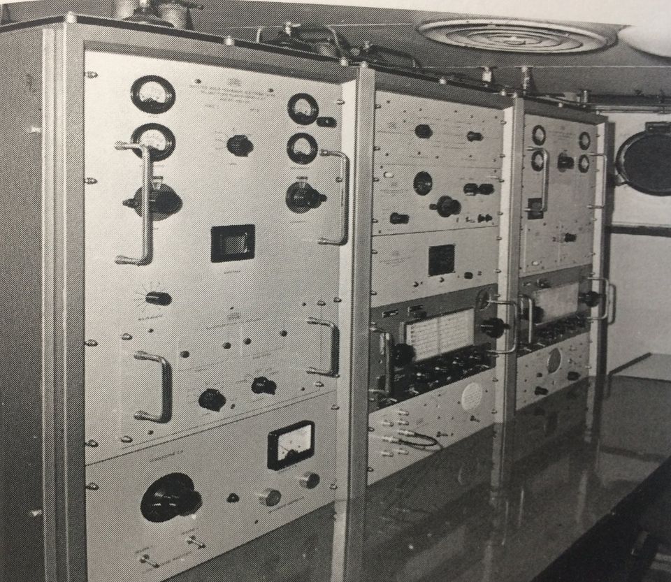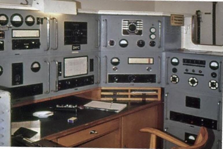 the middle row on the right and left. It covers the range from 100 kHz to 28.5 MHz in eight sub-ranges, offers the operating modes AM, SSB / CW and is equipped with 14 tubes. In between there is an "Apollo" receiver from Marconi Marine (15 kHz to 28 MHz, A1, A2, A3 and SSB). The station's emergency transmitter is installed at the top right.