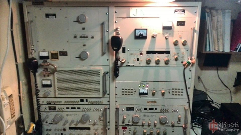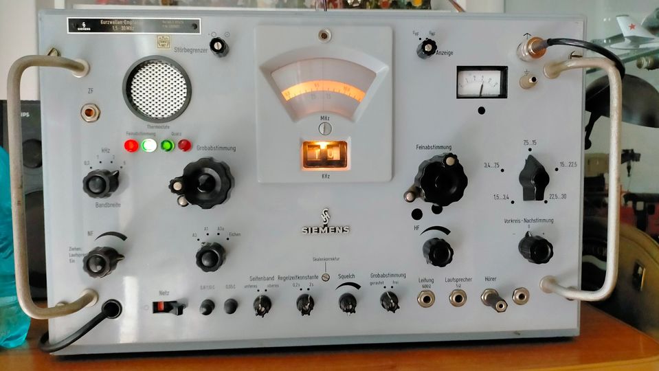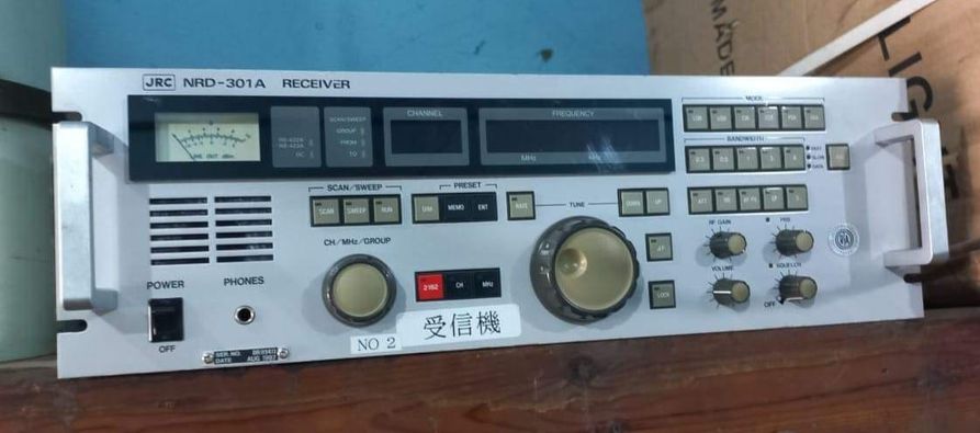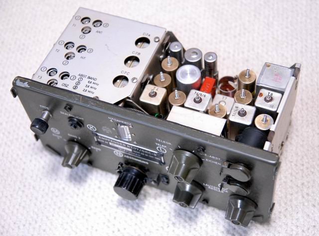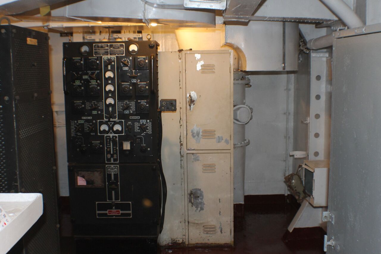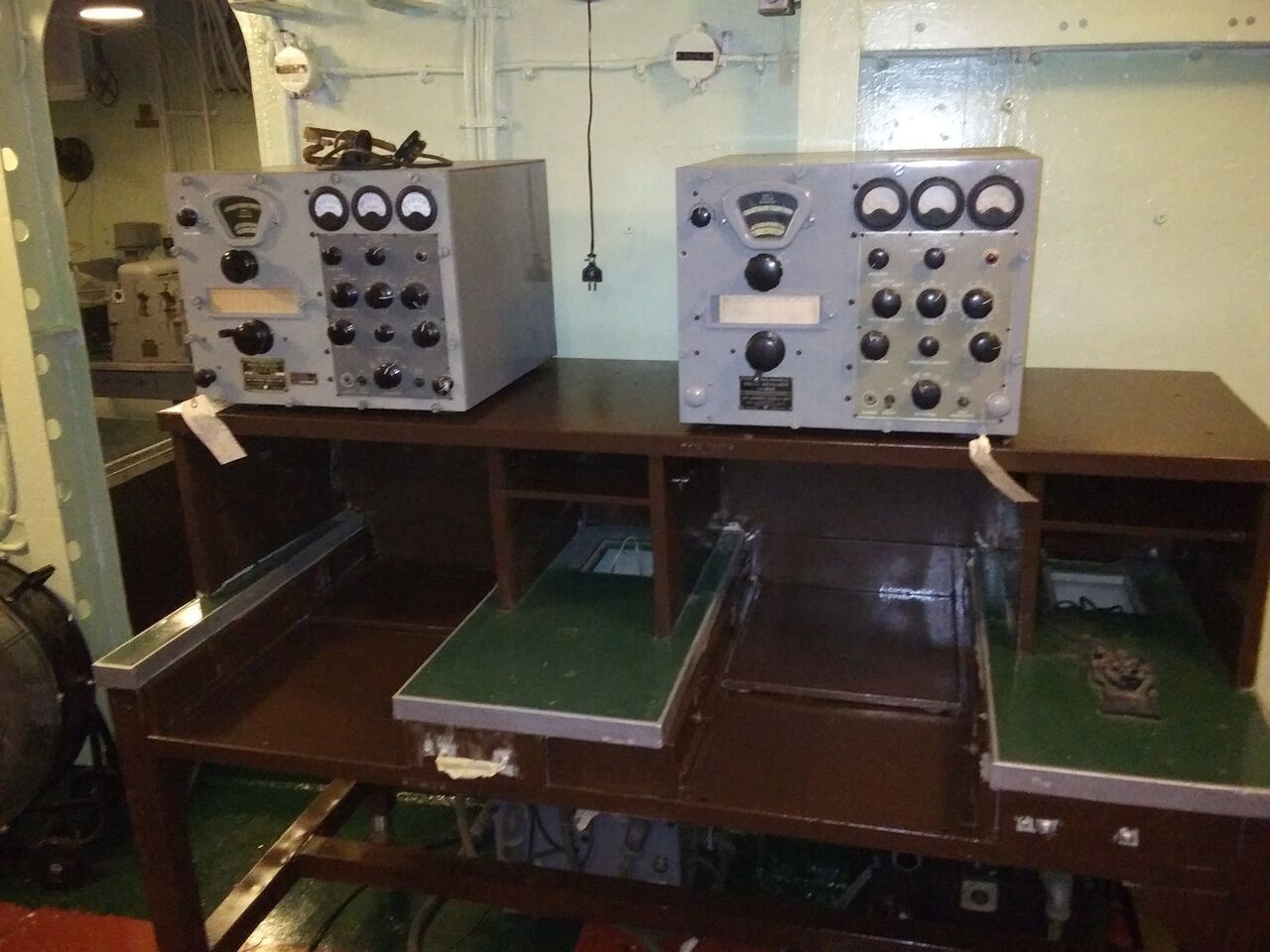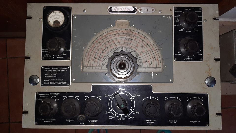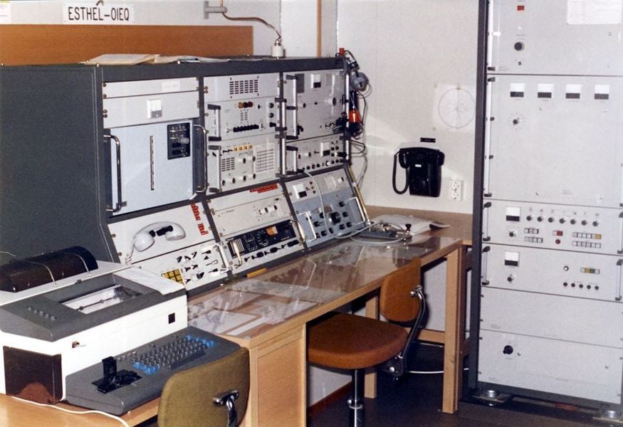 the middle row on the right and left. It covers the range from 100 kHz to 28.5 MHz in eight sub-ranges, offers the operating modes AM, SSB / CW and is equipped with 14 tubes. In between there is an "Apollo" receiver from Marconi Marine (15 kHz to 28 MHz, A1, A2, A3 and SSB). The station's emergency transmitter is installed at the top right.