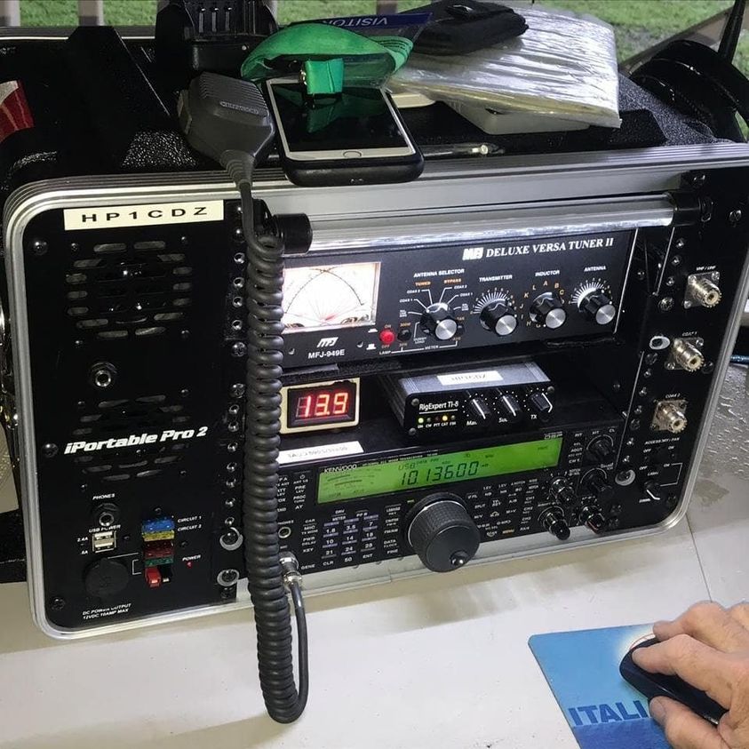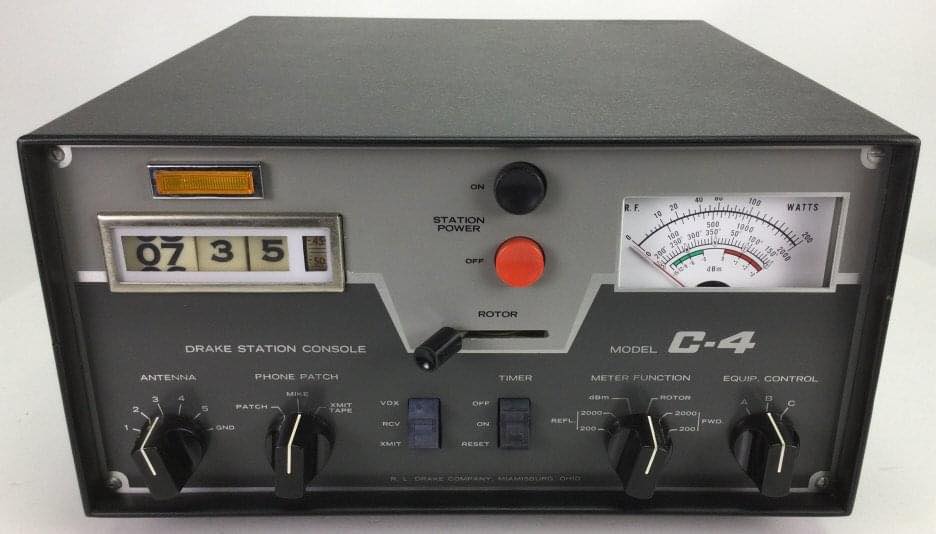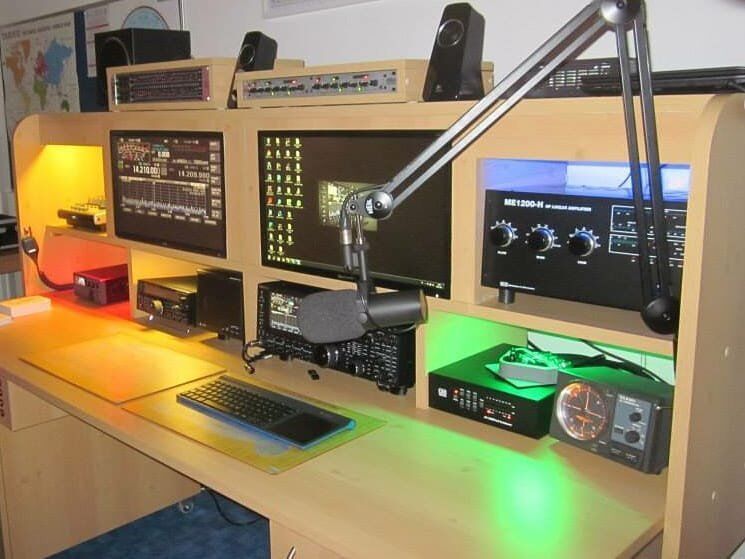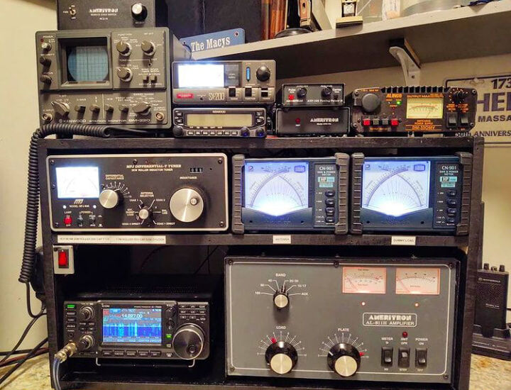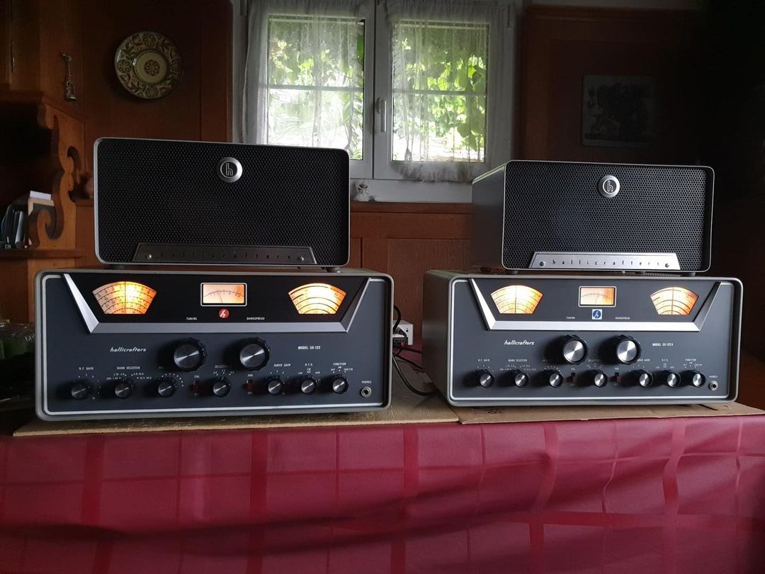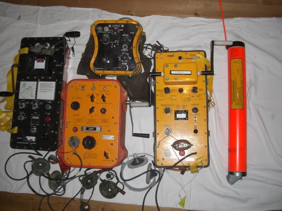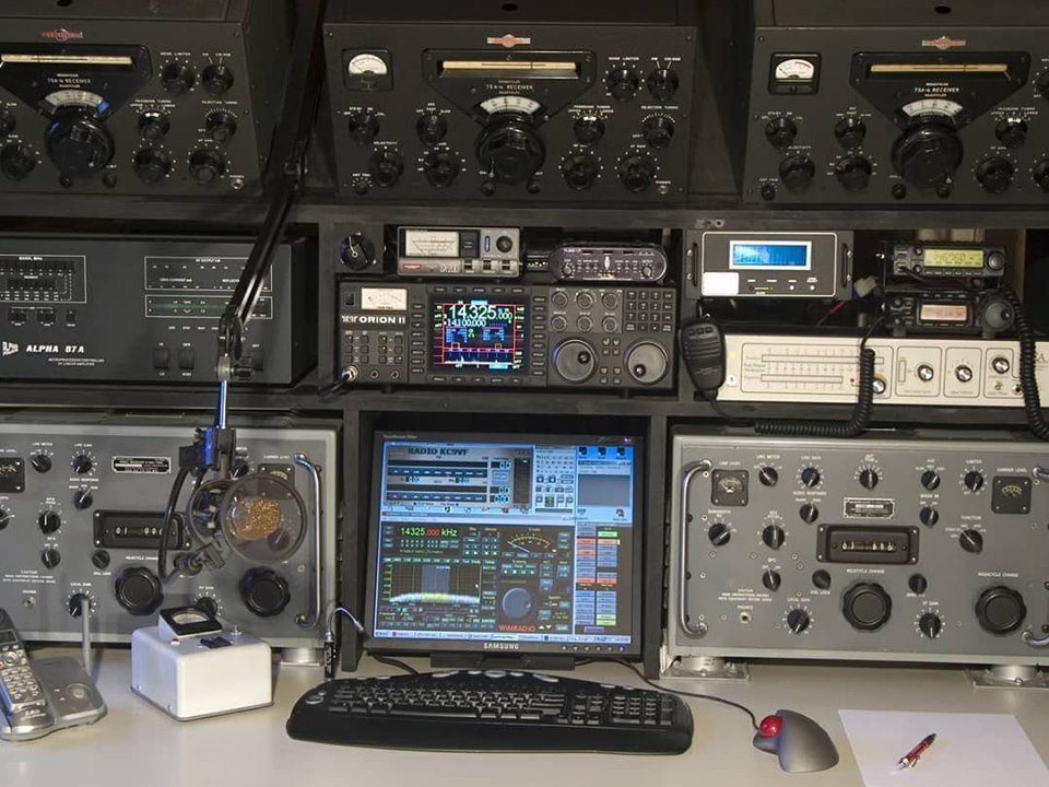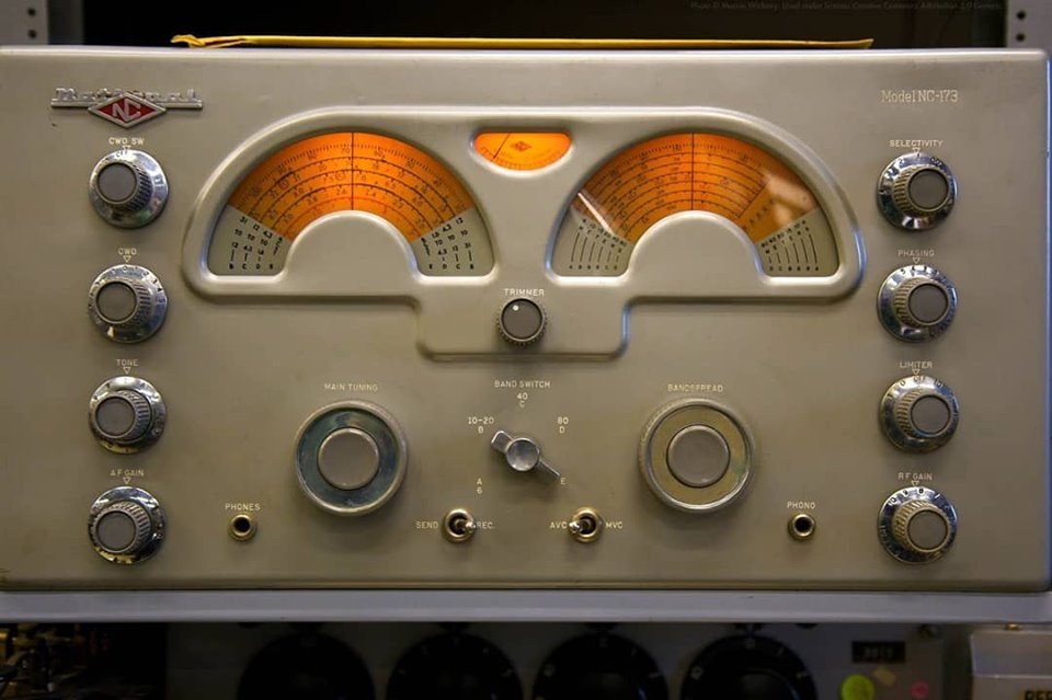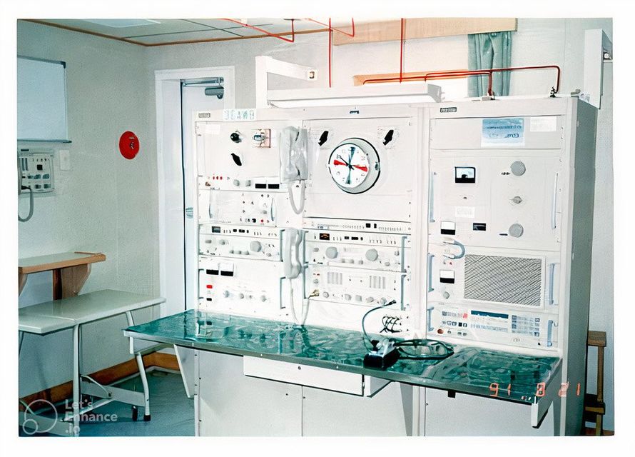 the middle row on the right and left. It covers the range from 100 kHz to 28.5 MHz in eight sub-ranges, offers the operating modes AM, SSB / CW and is equipped with 14 tubes. In between there is an "Apollo" receiver from Marconi Marine (15 kHz to 28 MHz, A1, A2, A3 and SSB). The station's emergency transmitter is installed at the top right.