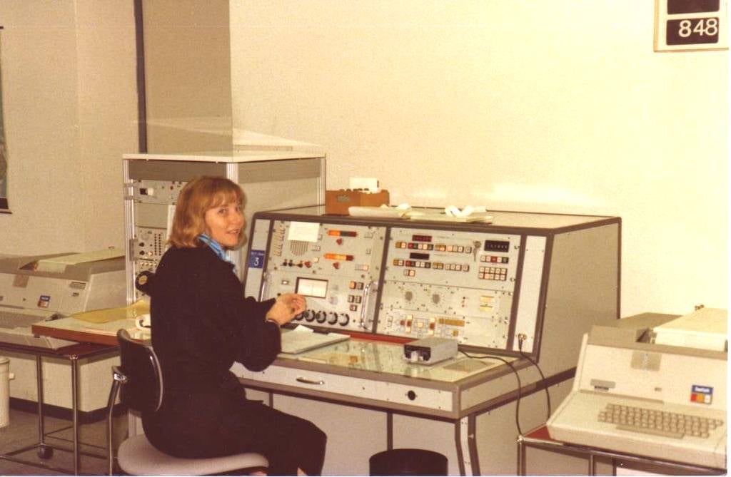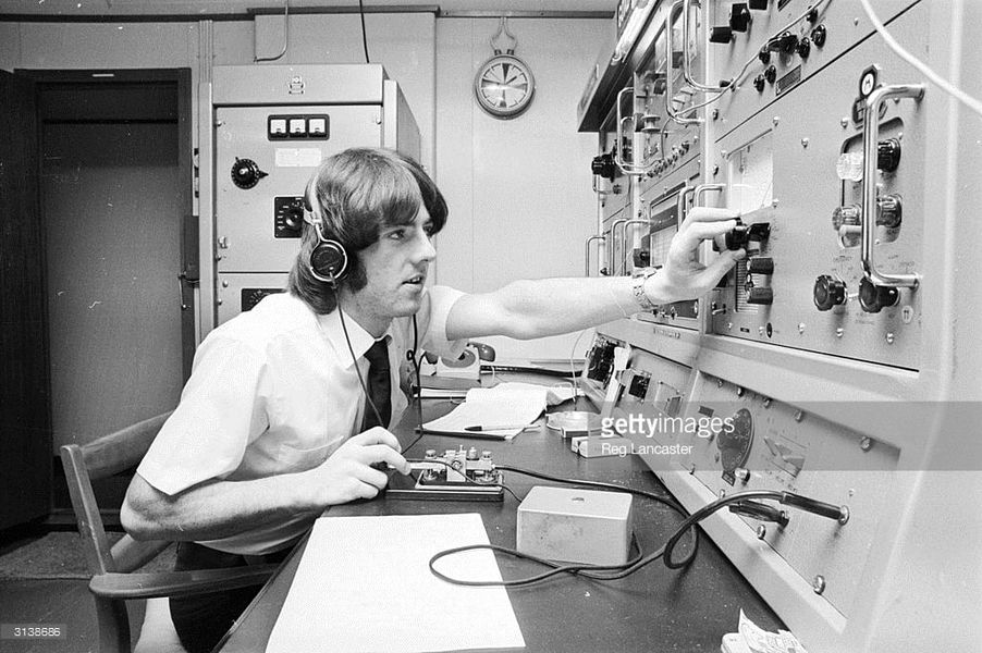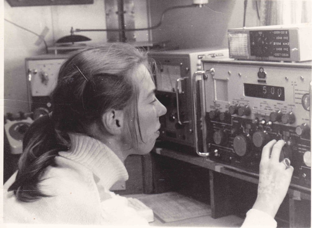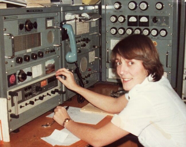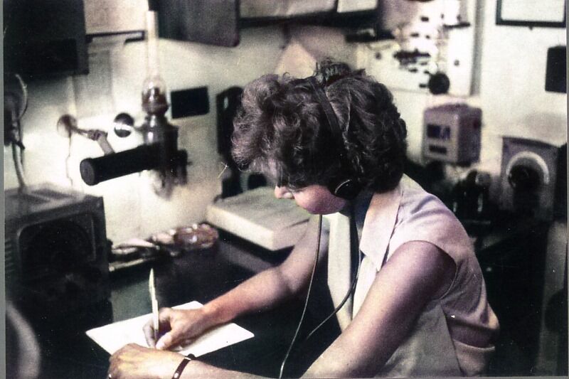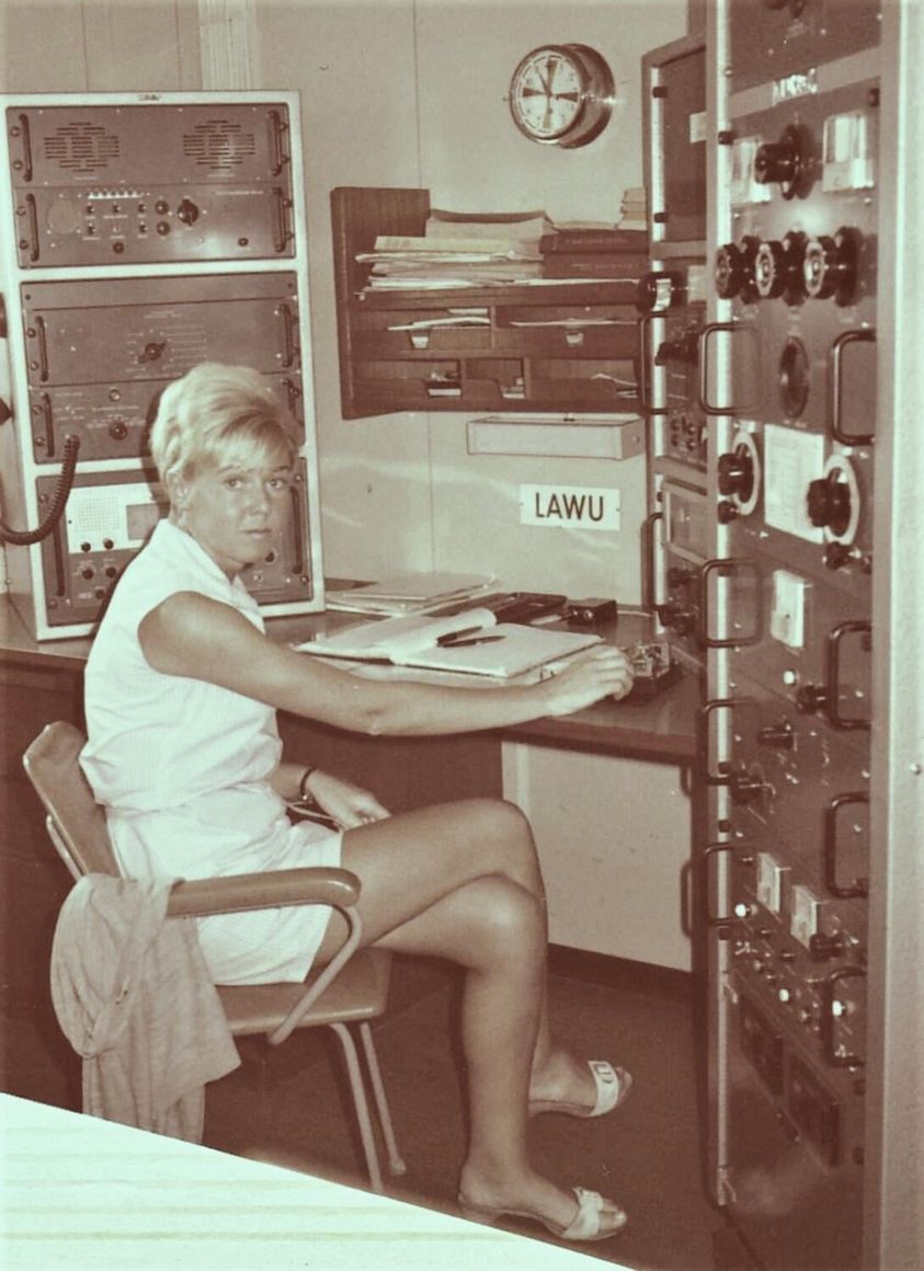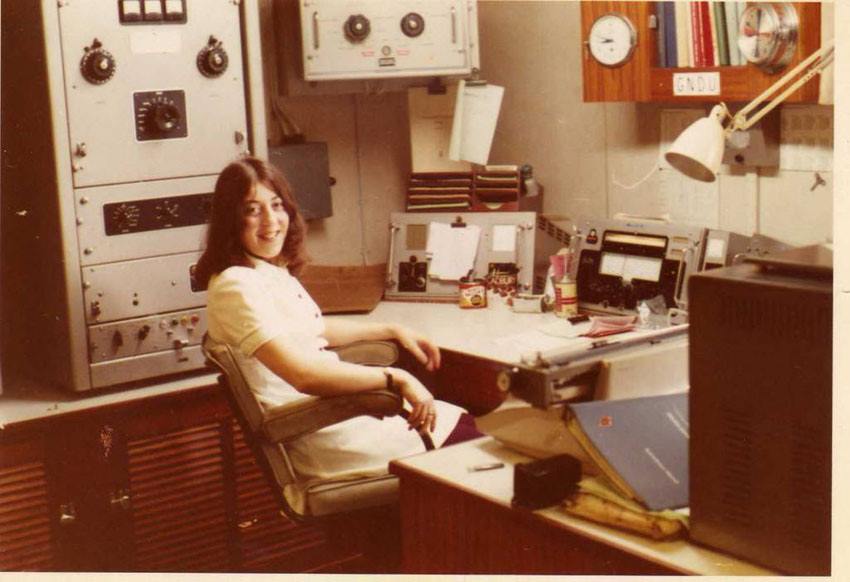 Auckland Radio ZLD operator Cilla Hardy. She is running 500 kcs radiotelegraphy at Console 3 in the West Operating room. Remote controls for the 1KW Dansk transmitter are the bottom right of the photo.