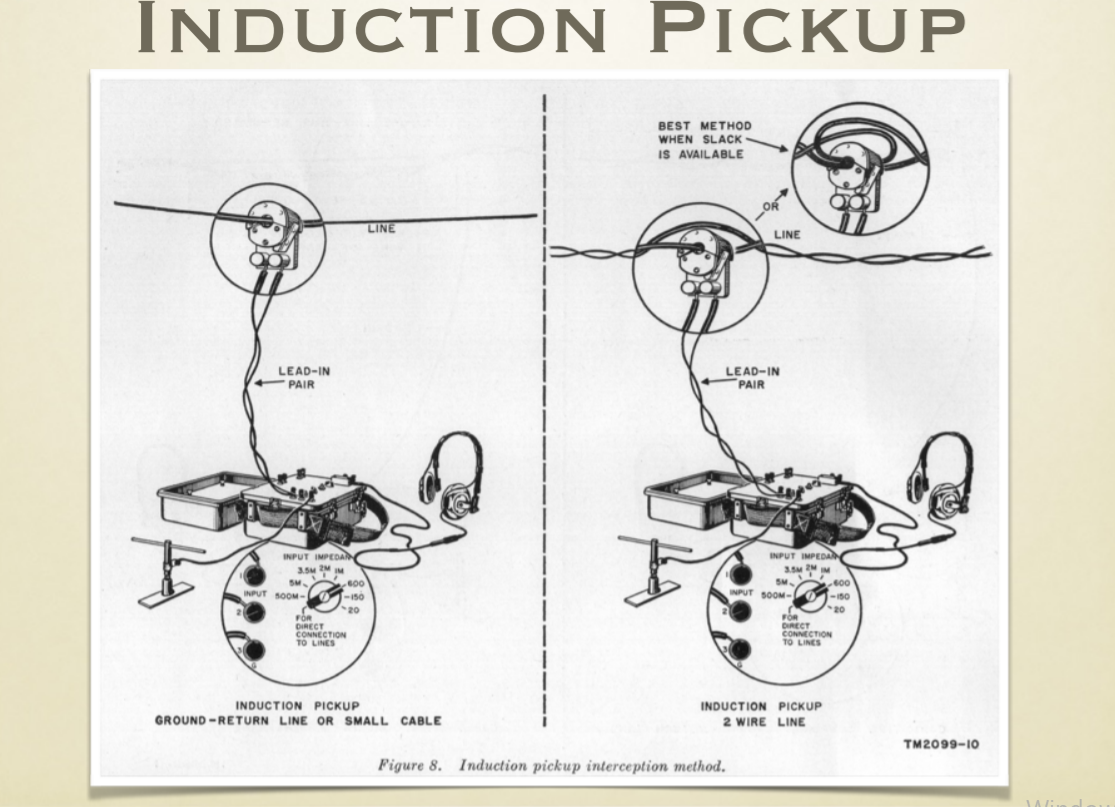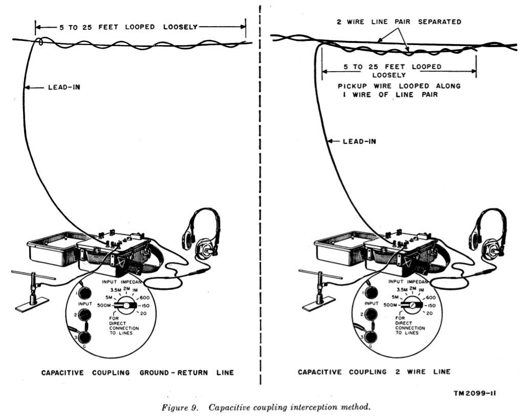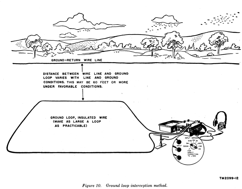 このセットでは、5つの異なる傍受方法が可能です。それらに入る前に、アナログ野戦電話で使用される配線には2つの異なるスタイルがあることを理解することが重要です。1つのスタイルでは、ステーション間で1対のワイヤーを使用します。このスタイルは、クロストークやその他の干渉を受けにくく、回路の不正な盗聴方法が少ないため、好ましい方法です。しかし、便宜として、ステーション間に1本のワイヤがあり、回路のリターンパスが各ステーションのグラウンドステークを介して地面を通過する別のスタイルの配線があります。この2番目のステーションには、半分のワイヤを使用するという利点があります。また、1つのワイヤが切断されたときに、損傷した回路をすばやく動作に戻すために使用することもできます。