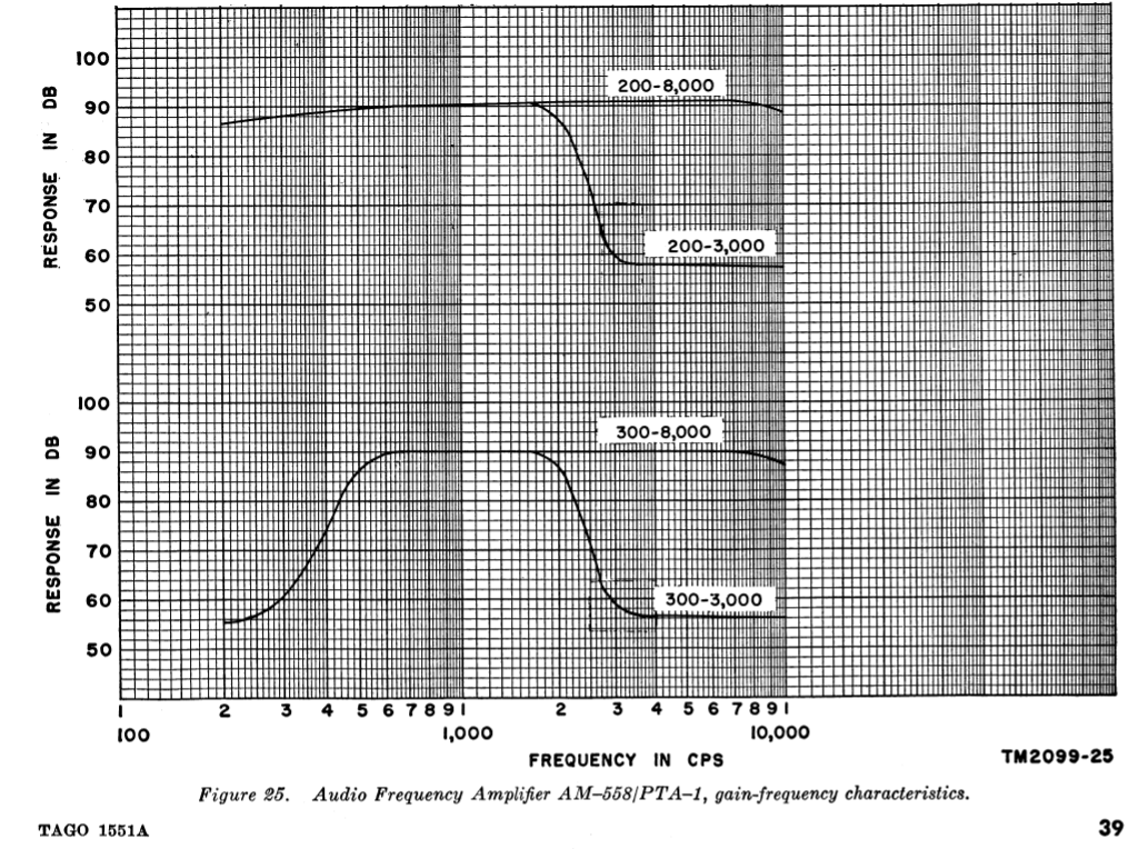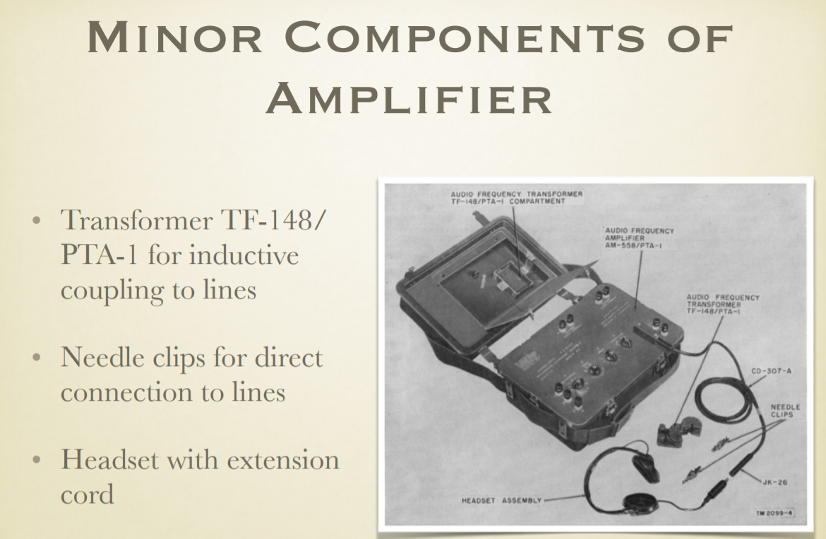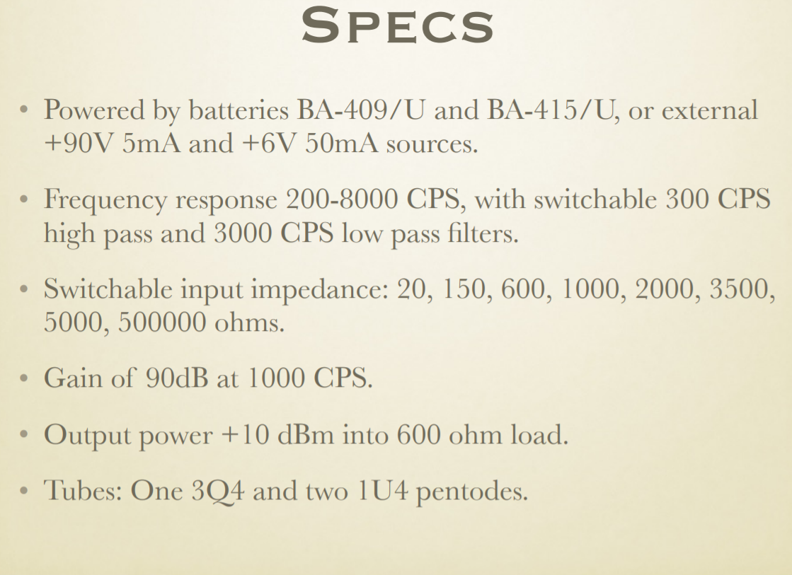 アンプは、内部バッテリー(BA-409 / UおよびBA-415 / Uにそれぞれ1つずつ)または外部電源のいずれかで電力を供給できます。いずれの場合も、チューブフィラメントには6VDC 50mA、チューブプレートには90VDC5mAが必要です。1,000サイクル/秒(cps)で90dBの最小ゲインがあり、公称周波数応答は200 cps〜8,000cpsです。切り替え可能な300cpsのハイパスフィルターと、切り替え可能な3,000cpsのローパスフィルターを備えています。+ 10dBmのオーディオ出力電力を提供します。入力インピーダンスは20オームから500kオームまで調整可能で、電話回線に直接接続するためのさらに高いインピーダンスモードがあります。野戦電話接続用の避雷器が2つ含まれ、さらに2つのスペアがケース内に保管されています。セットには録音機能は内蔵されていませんが、録音機器RC-169などの外部録音機器で使用できます。