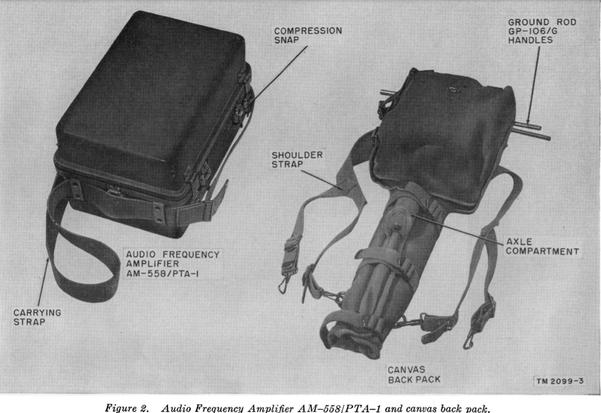 アンプには耐候性カバーとキャリングストラップが付いています。アンプの蓋には、延長ケーブル付きのヘッドセット、クランプオン誘導ピックアップコイル、および絶縁された野戦電話線に直接接続するための絶縁貫通クリップ用の収納スペースがあります。