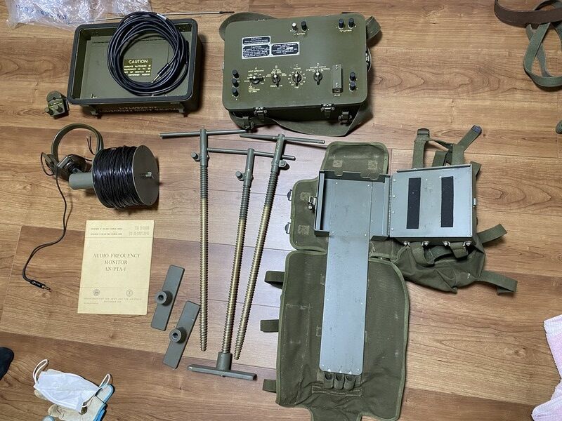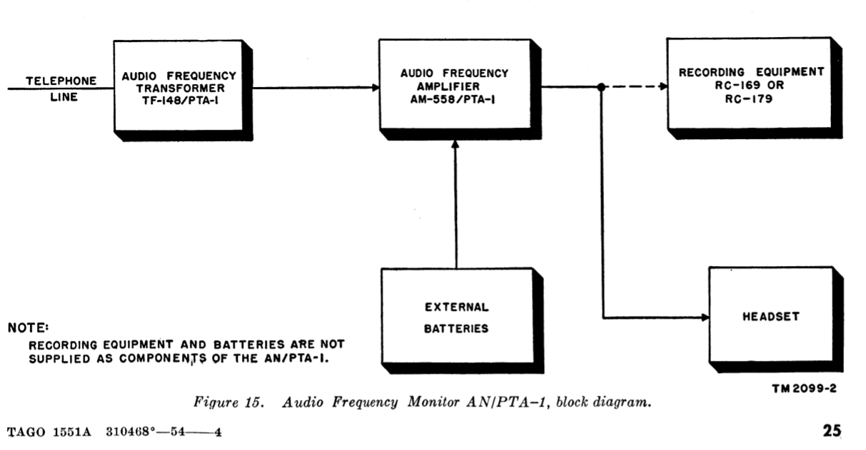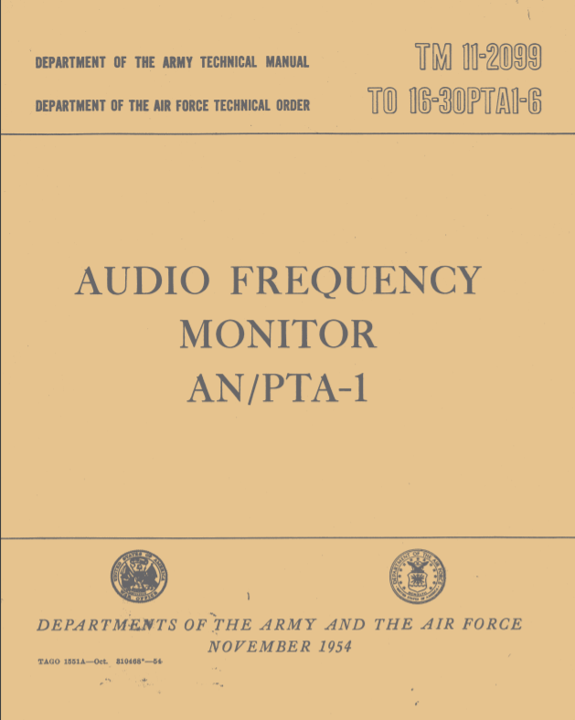 可聴周波数モニターAN / PTA-1(図1)は、電話回線やフィールドケーブルを介して送信される通信信号を傍受するために使用されるワイヤータッピングデバイスで、200サイクル/秒(cps)から8,000cpsの範囲の周波数が使用されます。傍受された信号は、機器に付属のヘッドセットアセンブリで拾うか、サウンドレコーダーに録音することができます。録音機器は、可聴周波数モニターAN / PTA-1の一部として提供されていません。セットは輸送の便宜のために2つのユニットに詰められており、一人で簡単に輸送できます。