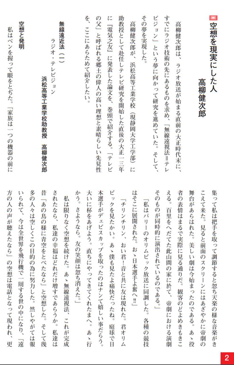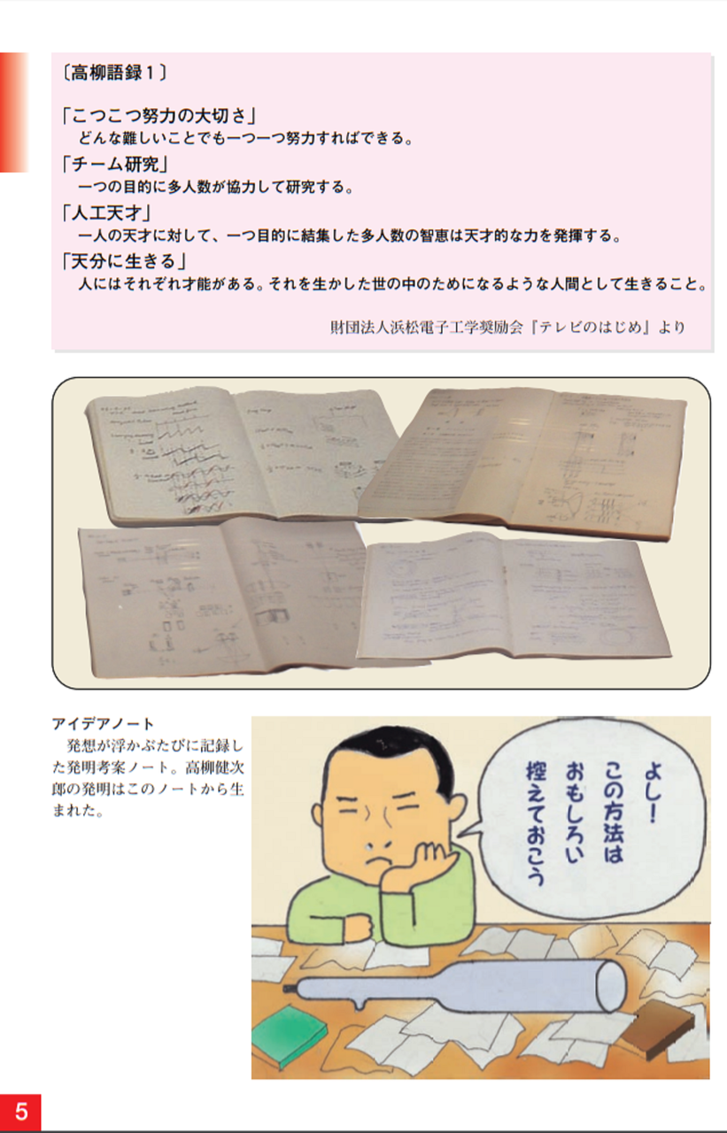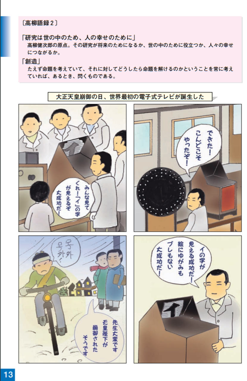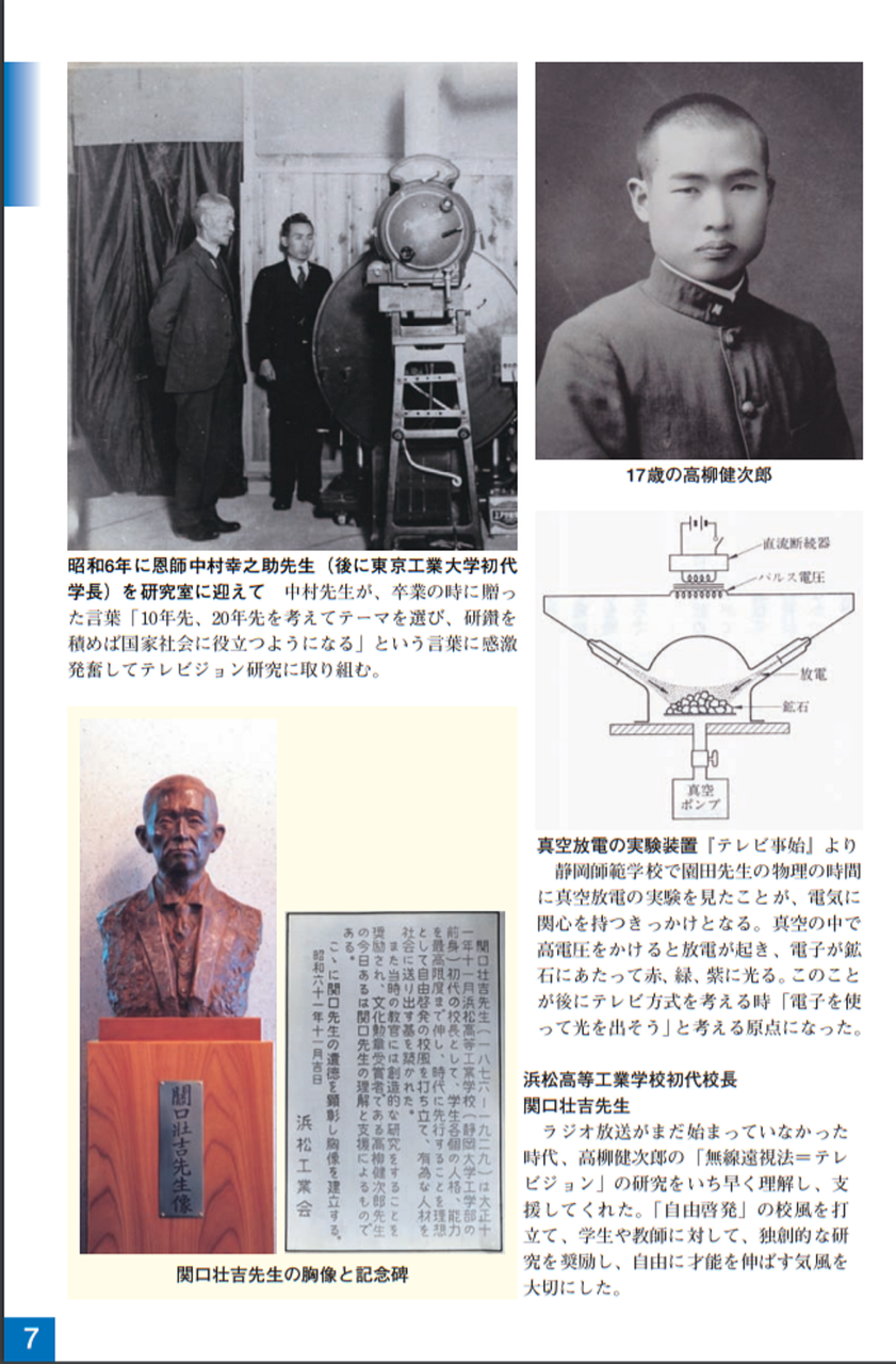 健次郎は、教師になりたいと思い、静岡師範学校(現:静岡大学教育学部)に進みました。そこで、物理学ことに電子による蛍光発光に強い興味を持ち、東京高等工業学校(現:東京工業大学)に進学し、大正10年同校を卒業しました。その後、神奈川県立工業学校の教師となりましたが、これは、高柳の希望を満足させるものではありませんでした。