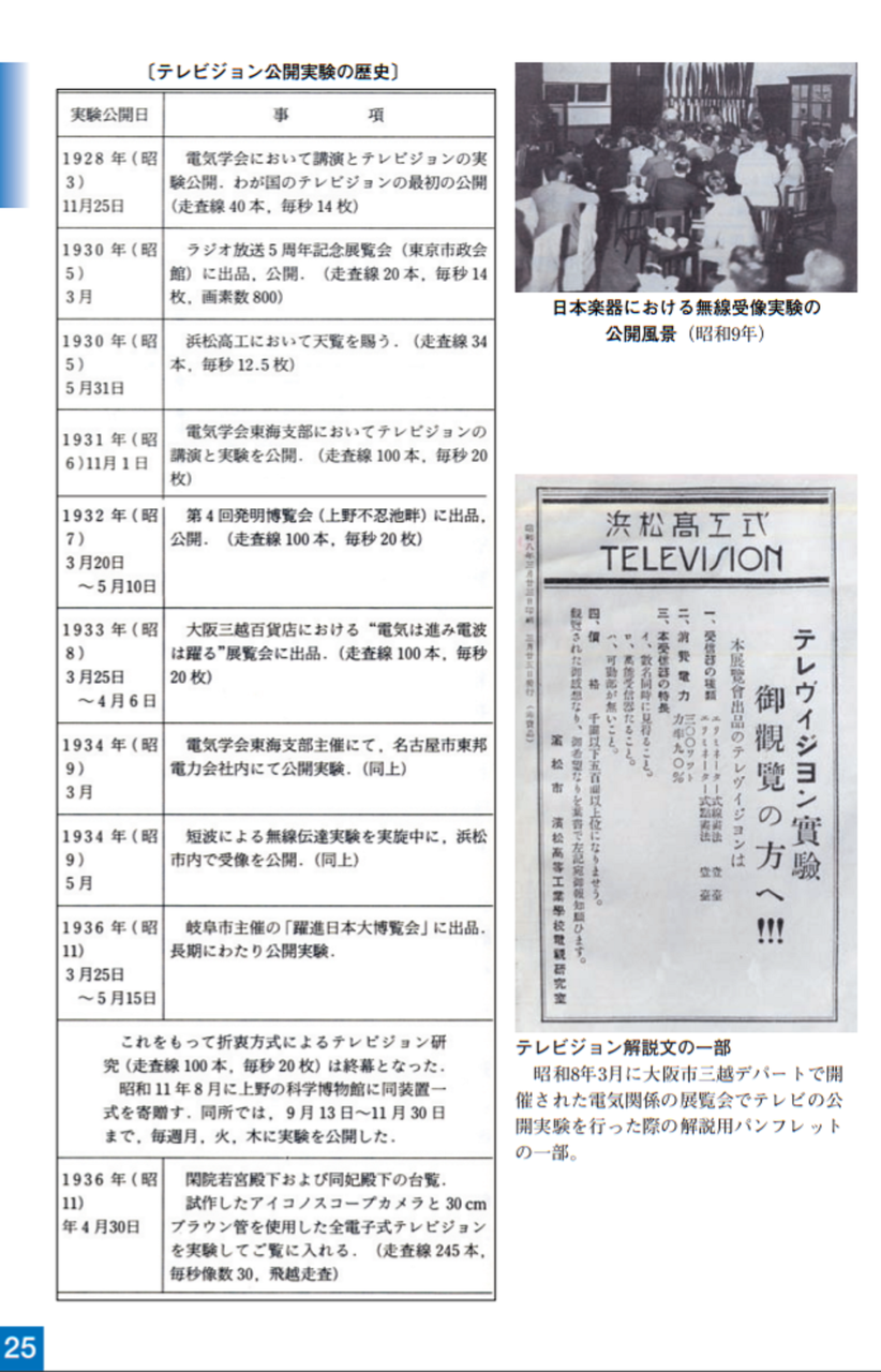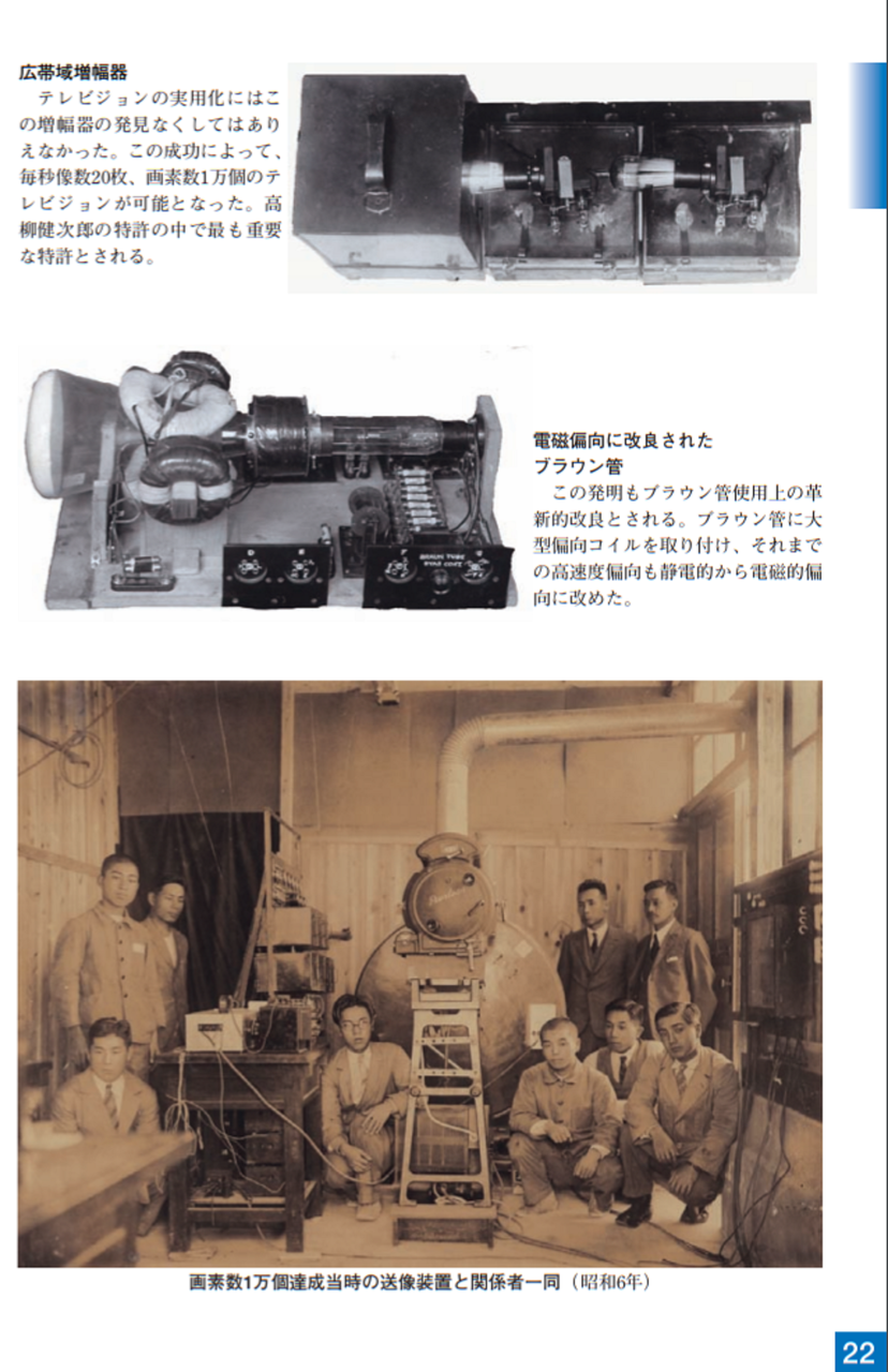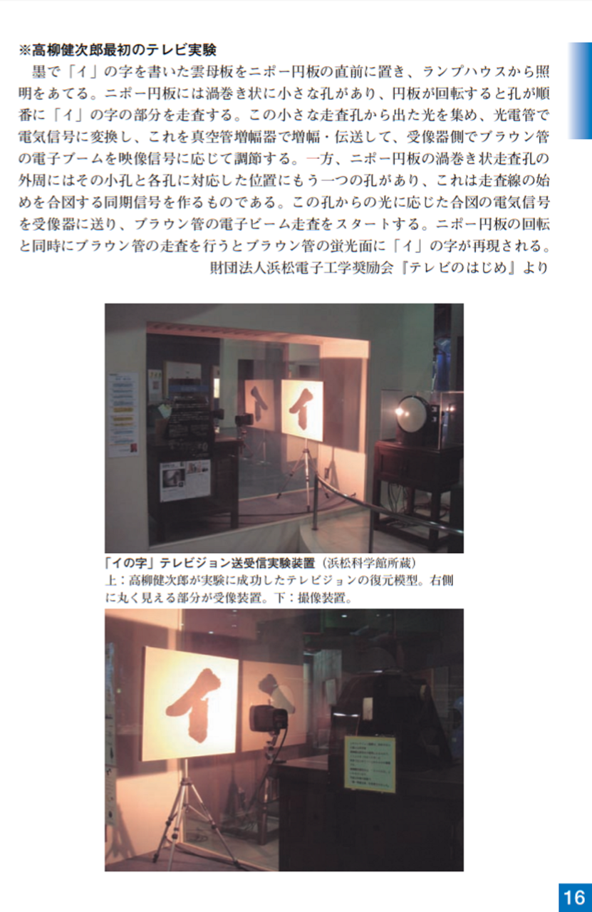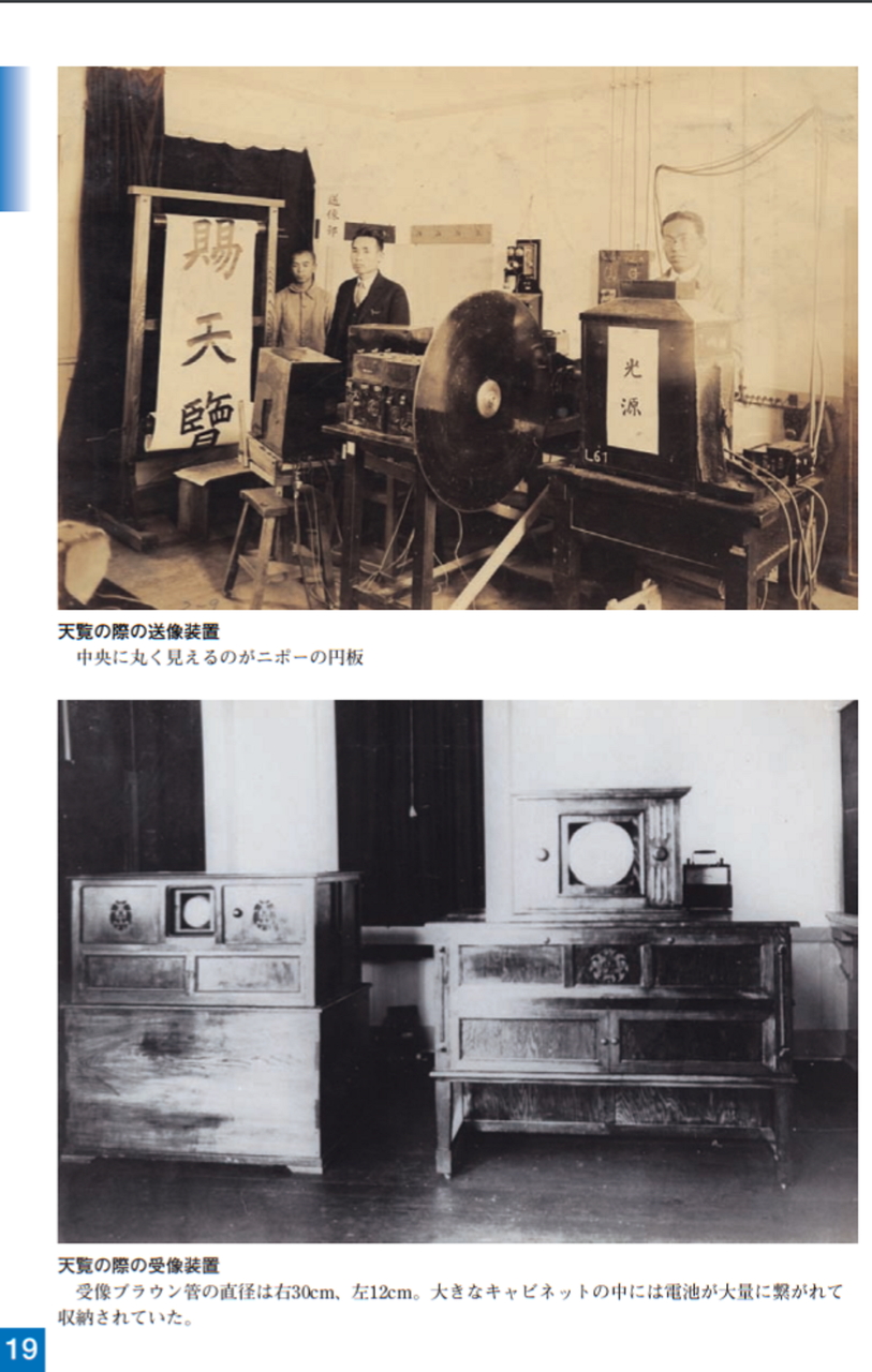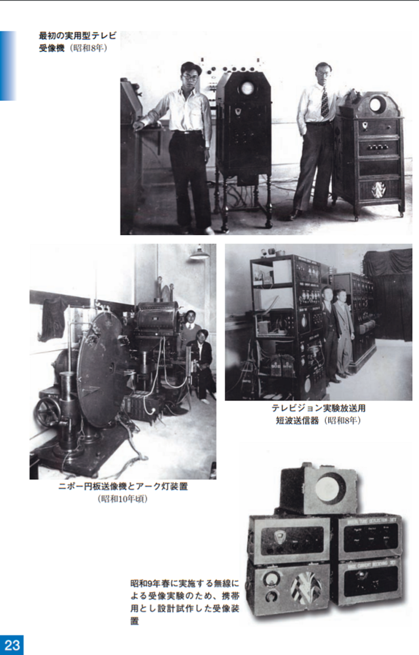 大正15年(1926)ニポー円板による撮像とブラウン管による表示方法で「イ」の字の表示に成功しました。ブラウン管を使った電子式テレビジョンの世界最初の実験でした。昭和5年(1930)には昭和天皇にもテレビジョンの実験をお見せすることができました。その後、昭和10年にはアイコノスコープによる撮像方式を取り入れ、全電子式テレビジョンを完成させました。