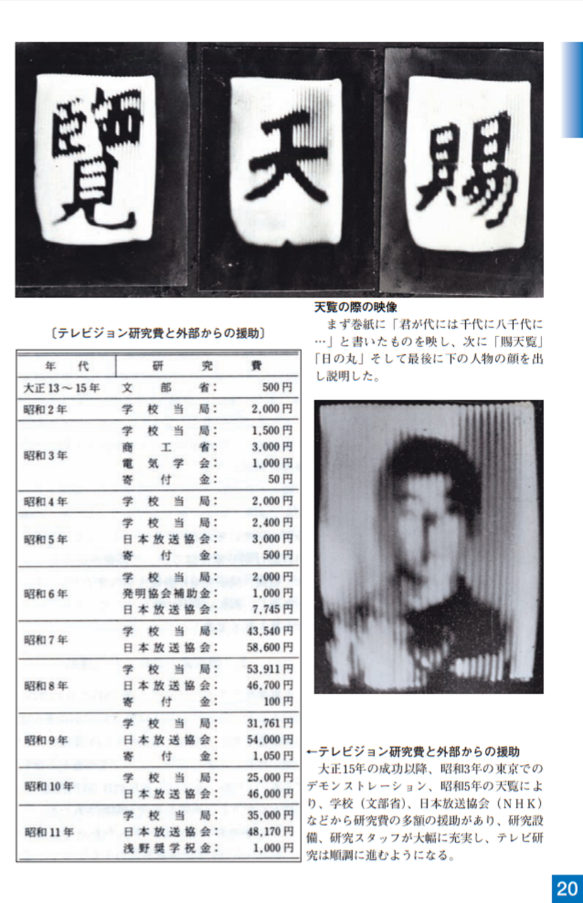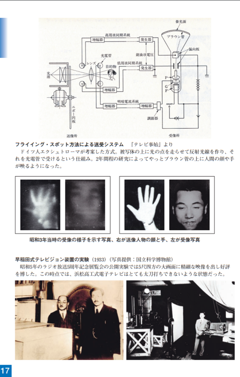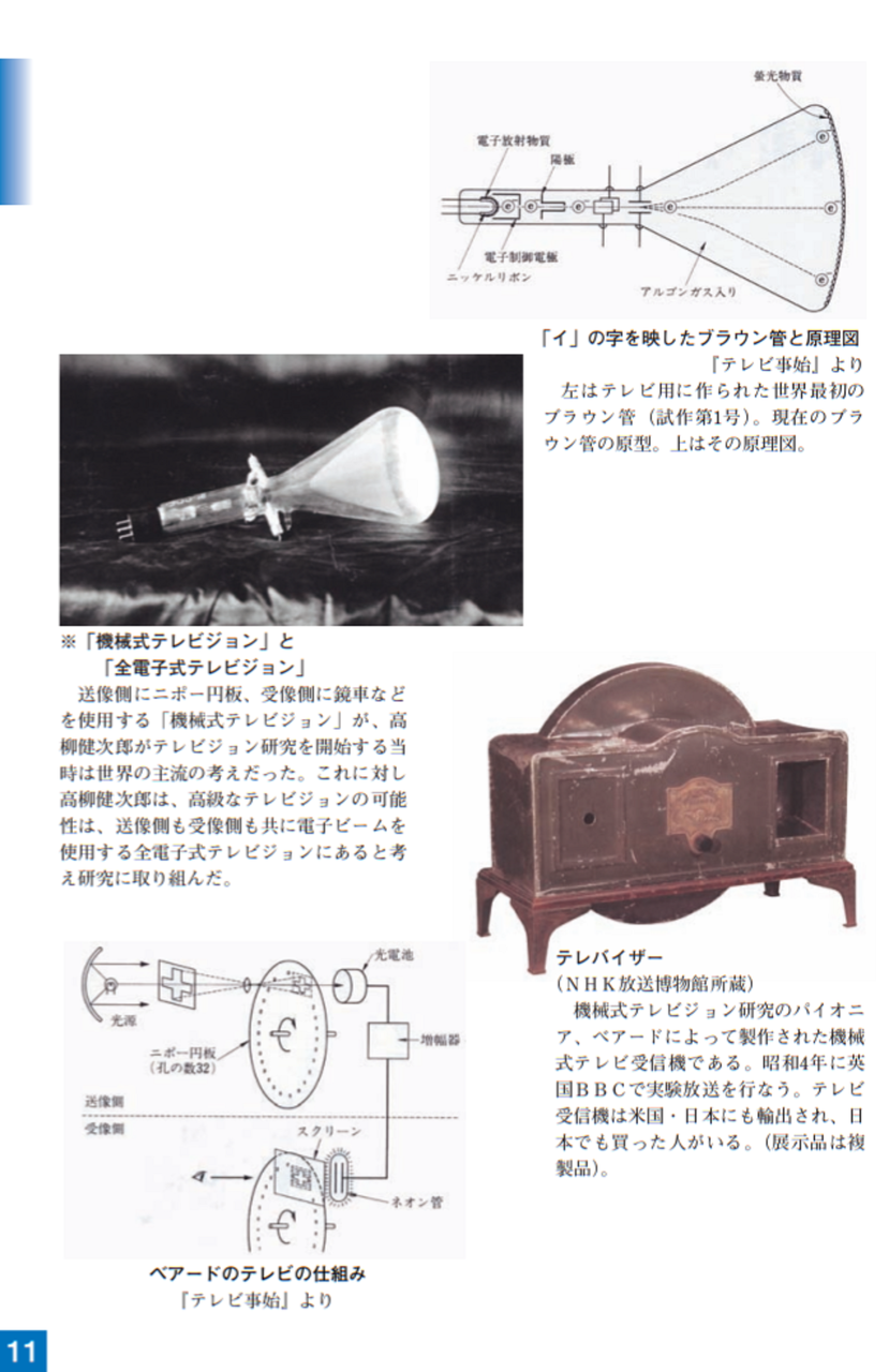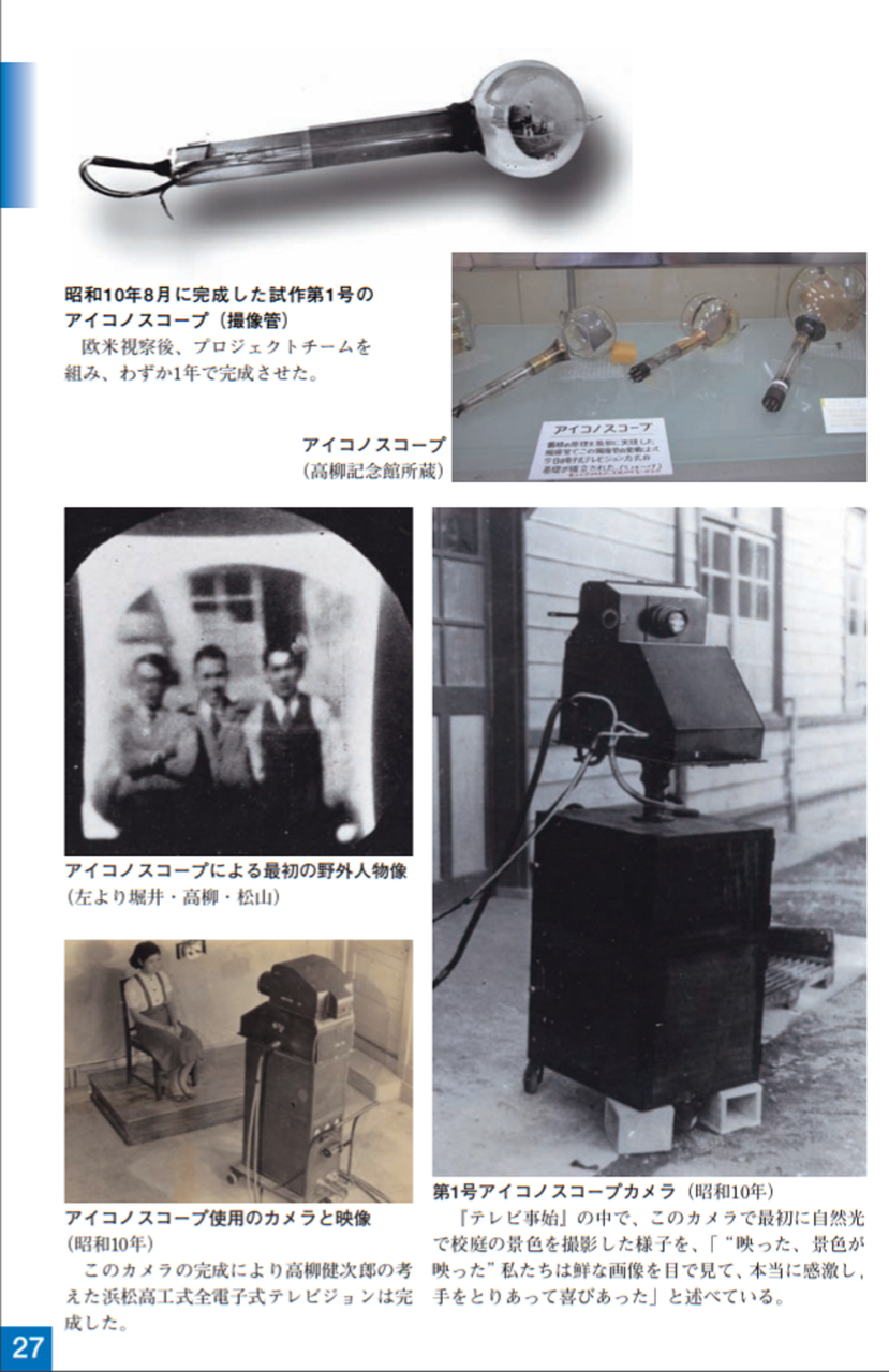 大正15年(1926)ニポー円板による撮像とブラウン管による表示方法で「イ」の字の表示に成功しました。ブラウン管を使った電子式テレビジョンの世界最初の実験でした。昭和5年(1930)には昭和天皇にもテレビジョンの実験をお見せすることができました。その後、昭和10年にはアイコノスコープによる撮像方式を取り入れ、全電子式テレビジョンを完成させました。
