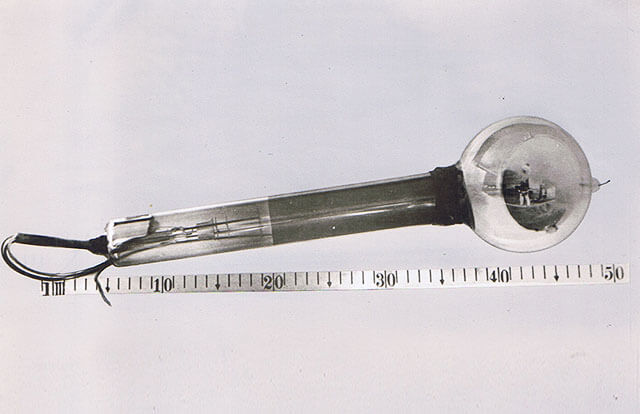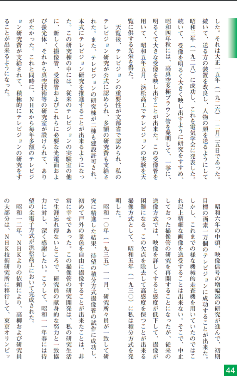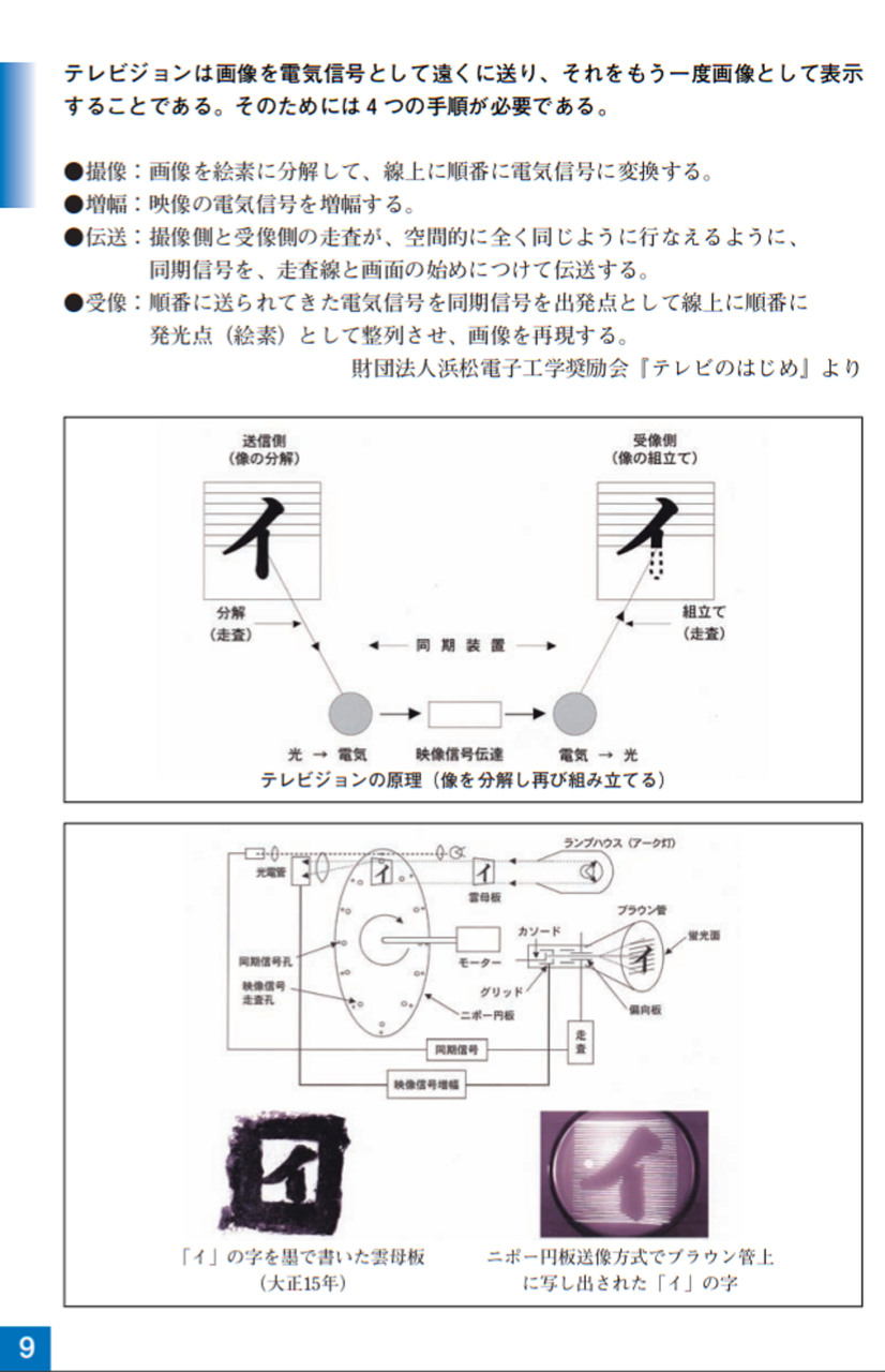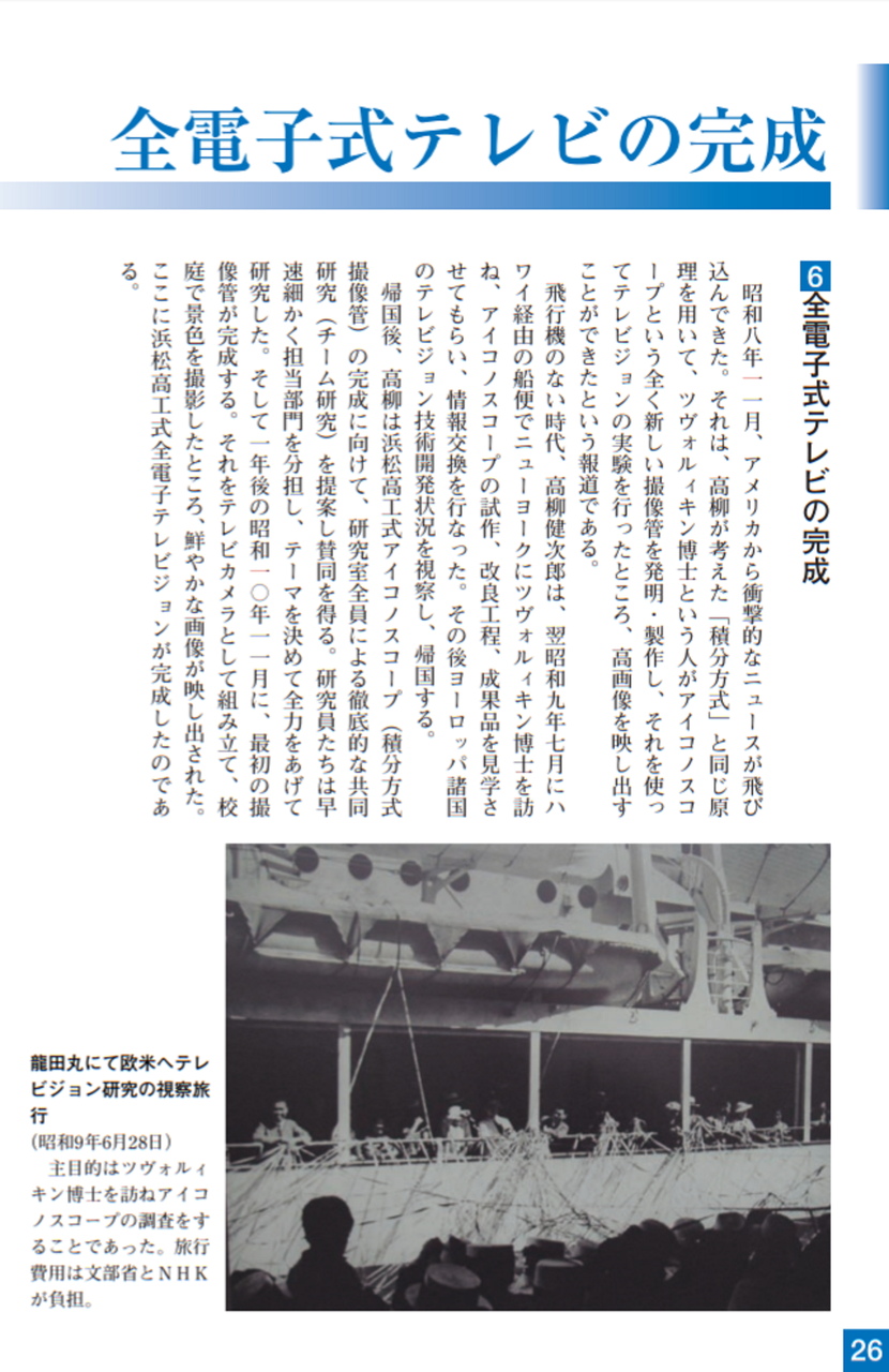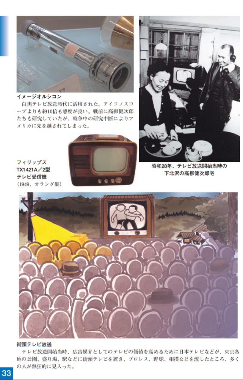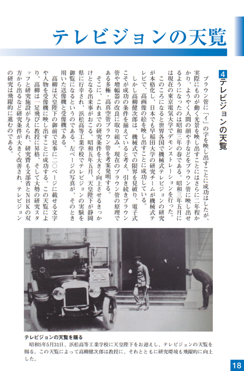 大正15年(1926)ニポー円板による撮像とブラウン管による表示方法で「イ」の字の表示に成功しました。ブラウン管を使った電子式テレビジョンの世界最初の実験でした。昭和5年(1930)には昭和天皇にもテレビジョンの実験をお見せすることができました。その後、昭和10年にはアイコノスコープによる撮像方式を取り入れ、全電子式テレビジョンを完成させました。