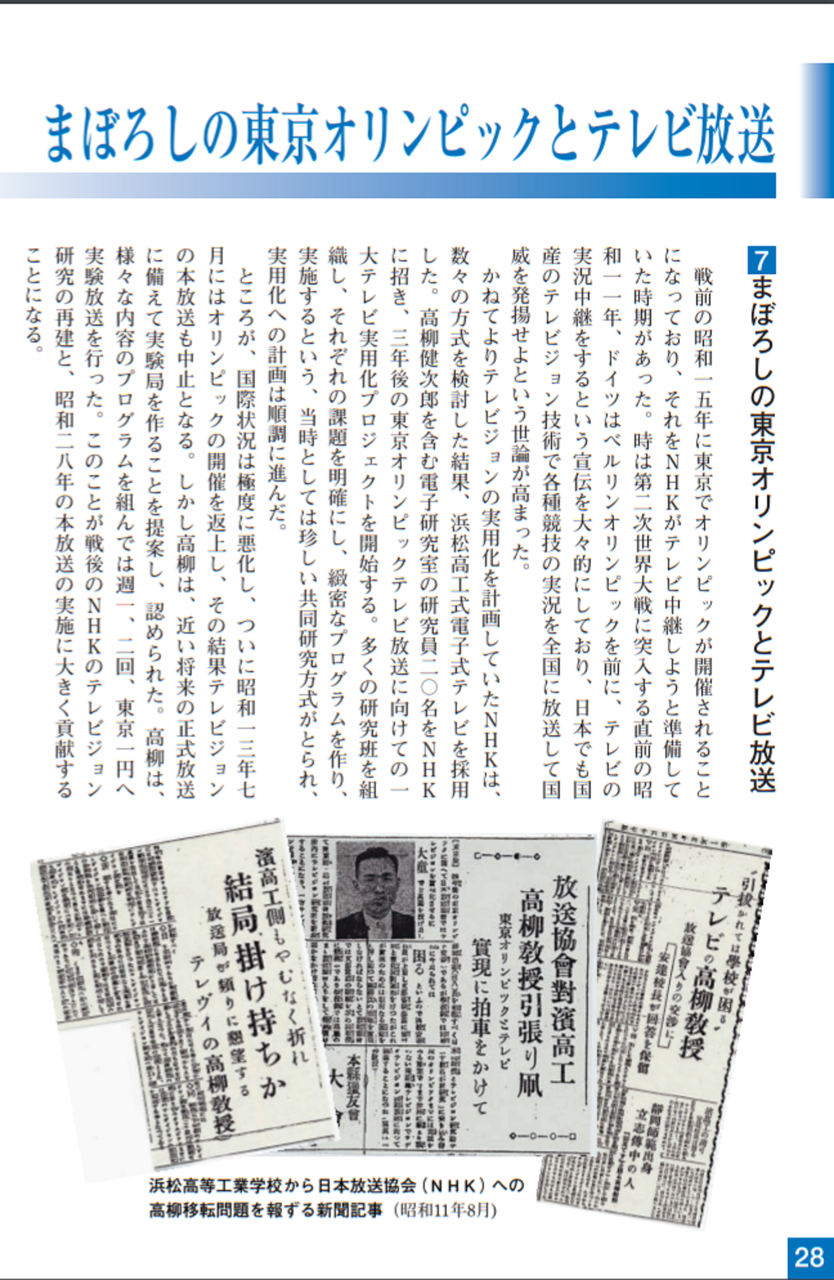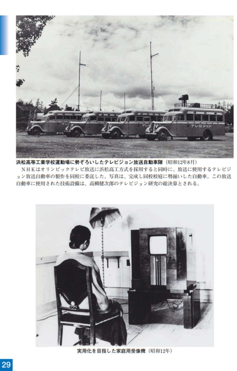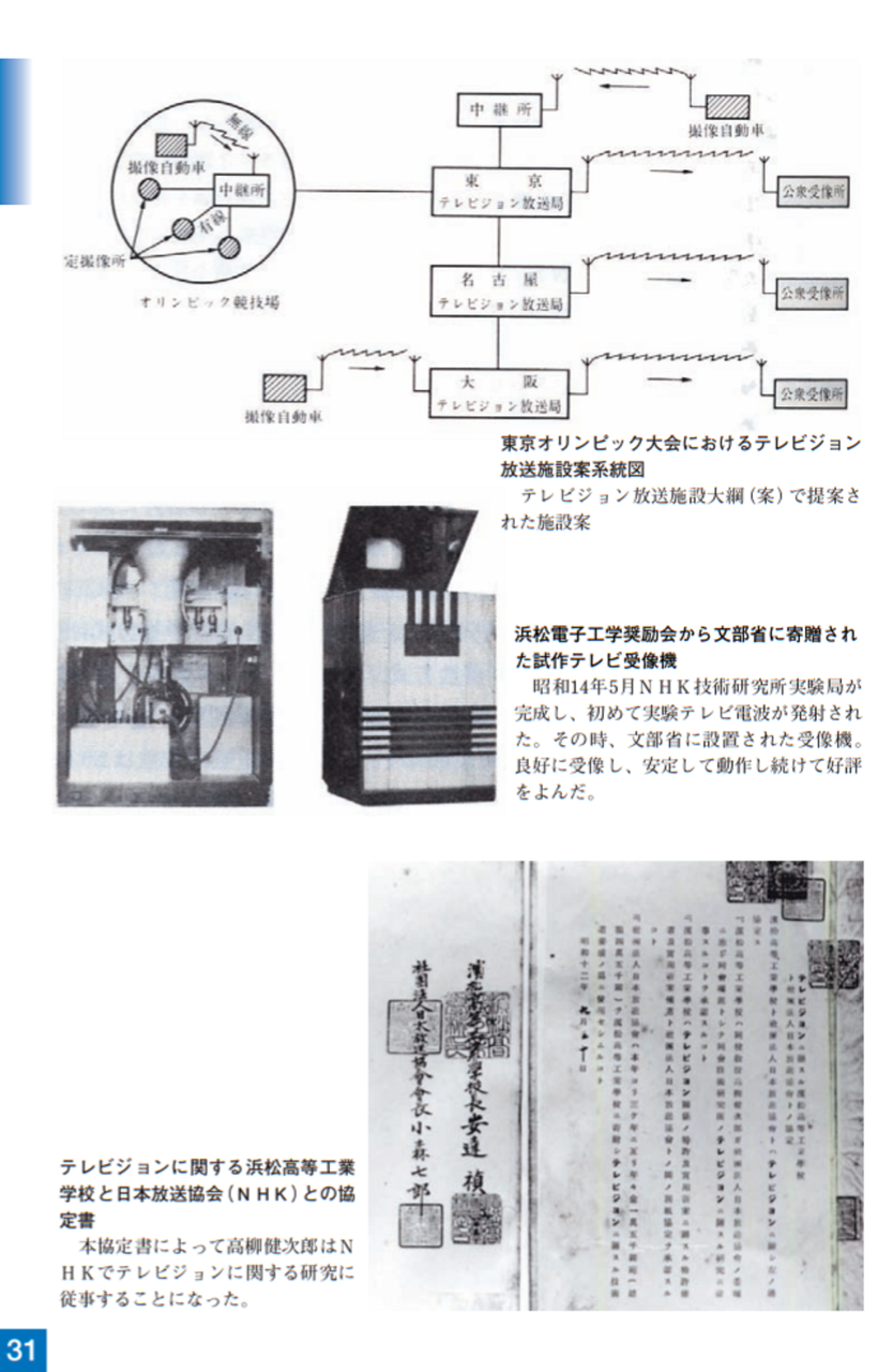 この頃、テレビジョンの将来性に期待がもたれ、昭和15年に予定されていた東京オリンピックをテレビ放送するという計画が国家プロジェクトとして取り上げられ、研究が大き<加速されました。高柳は昭和12年浜松高等工業学校教授のまま、NHK技術研究所に出向し、日本のテレビ技術開発のリーダーを努め、昭和13年には現在のテレビ規格に近い走査線数441本毎秒25枚の技術を完成させました。その後、第2次世界大戦の勃発によリテレビジョンの研究は中断されました。