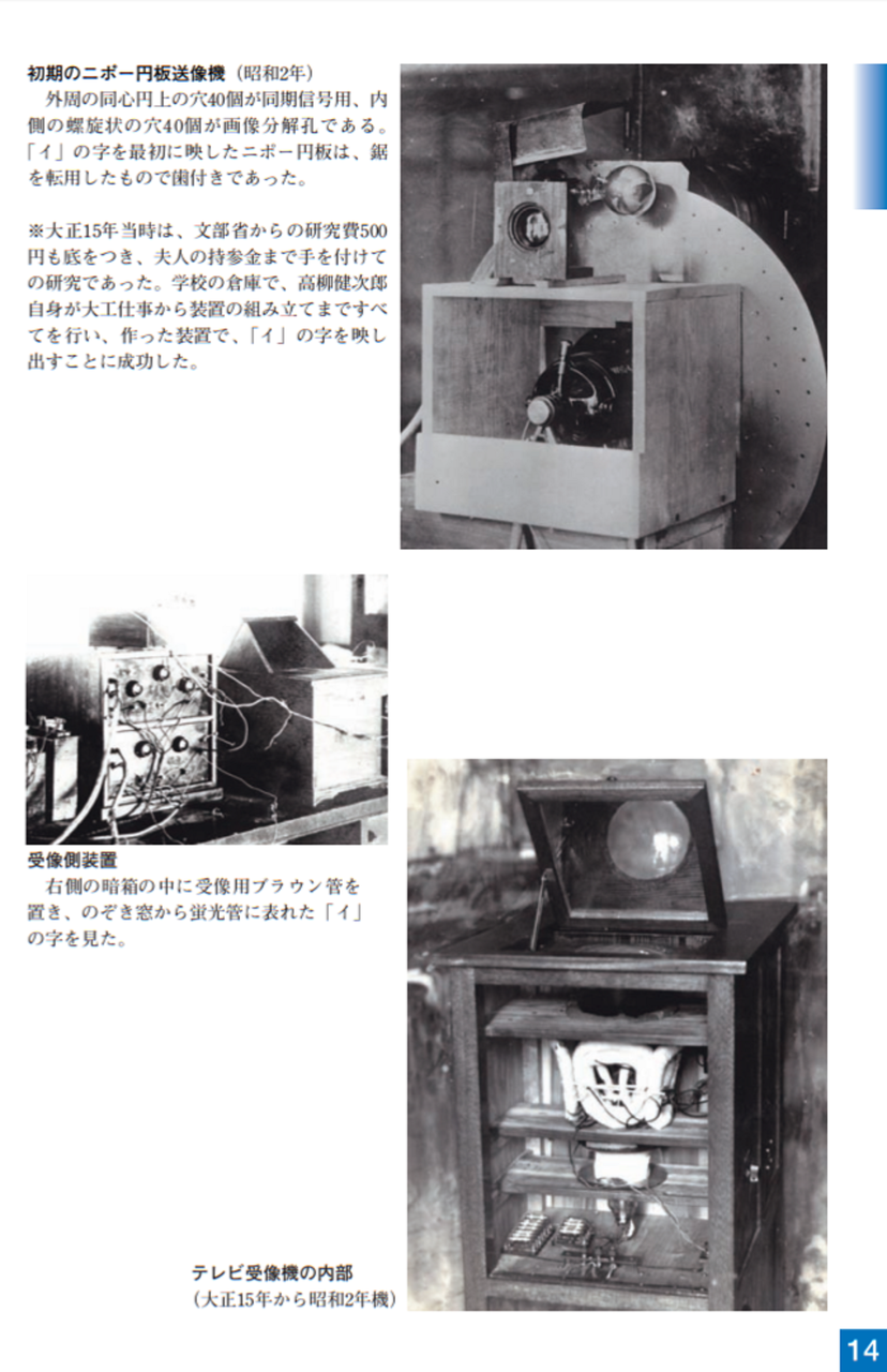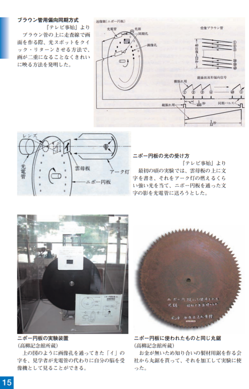 高柳はブラウン管を使用した電子式テレビジョンを世界で初めて提案しました。当時(大正13年~15年)(1924~26)はテレビカメラとしての送像の装置が電子式のものがなかったので、とりあえず、ニポー円板を用いて送像装置としての信号作りを行いました。