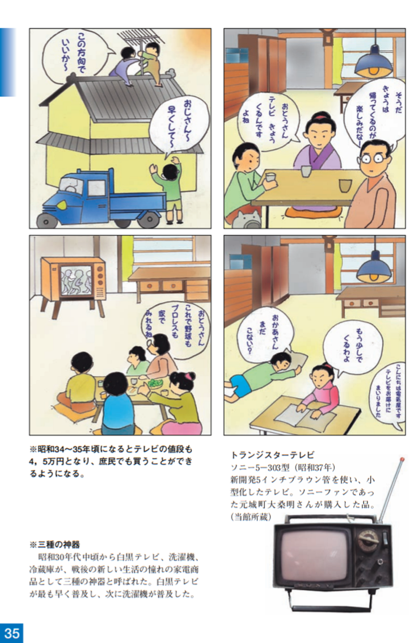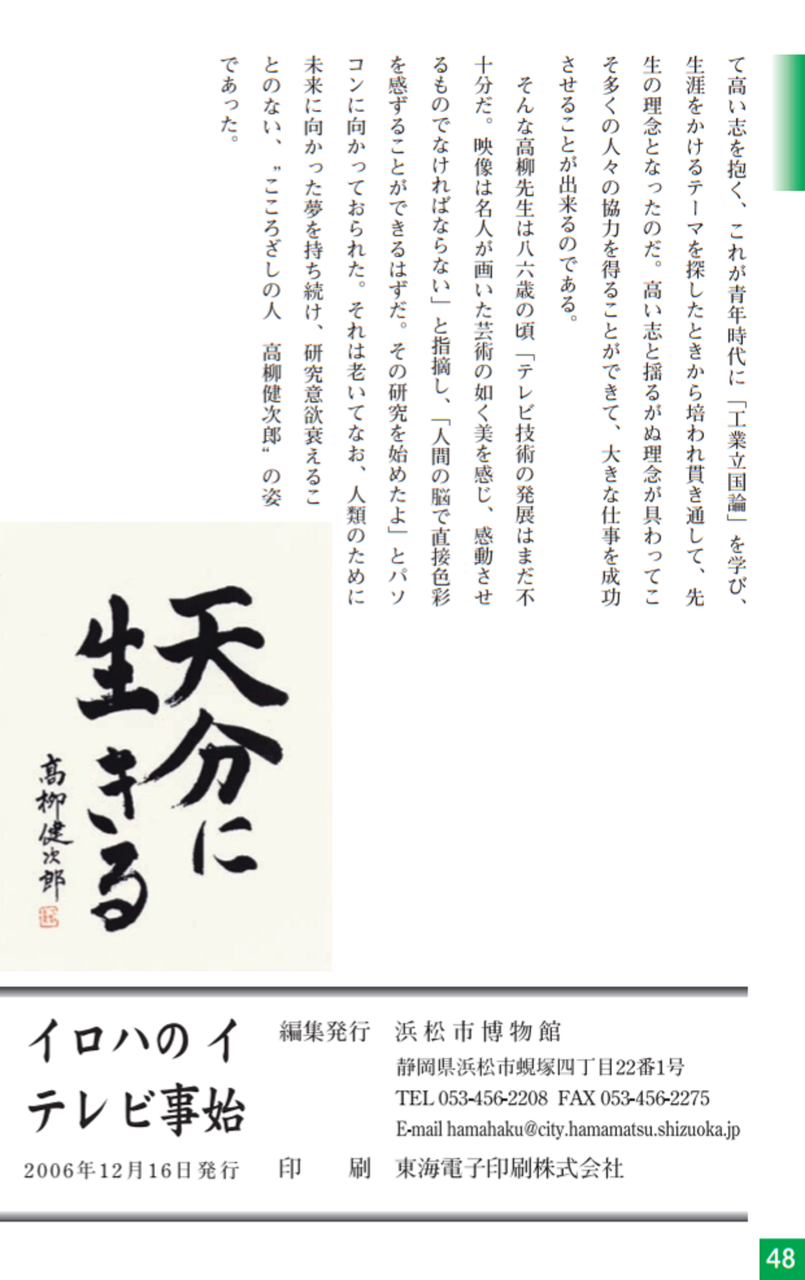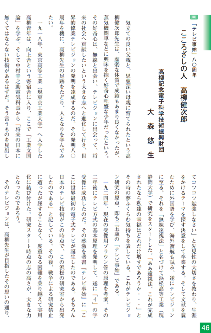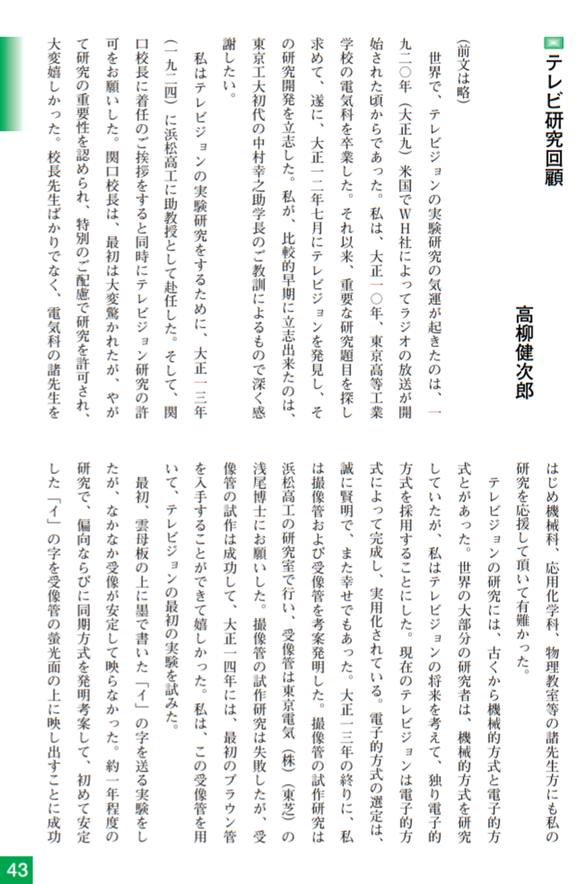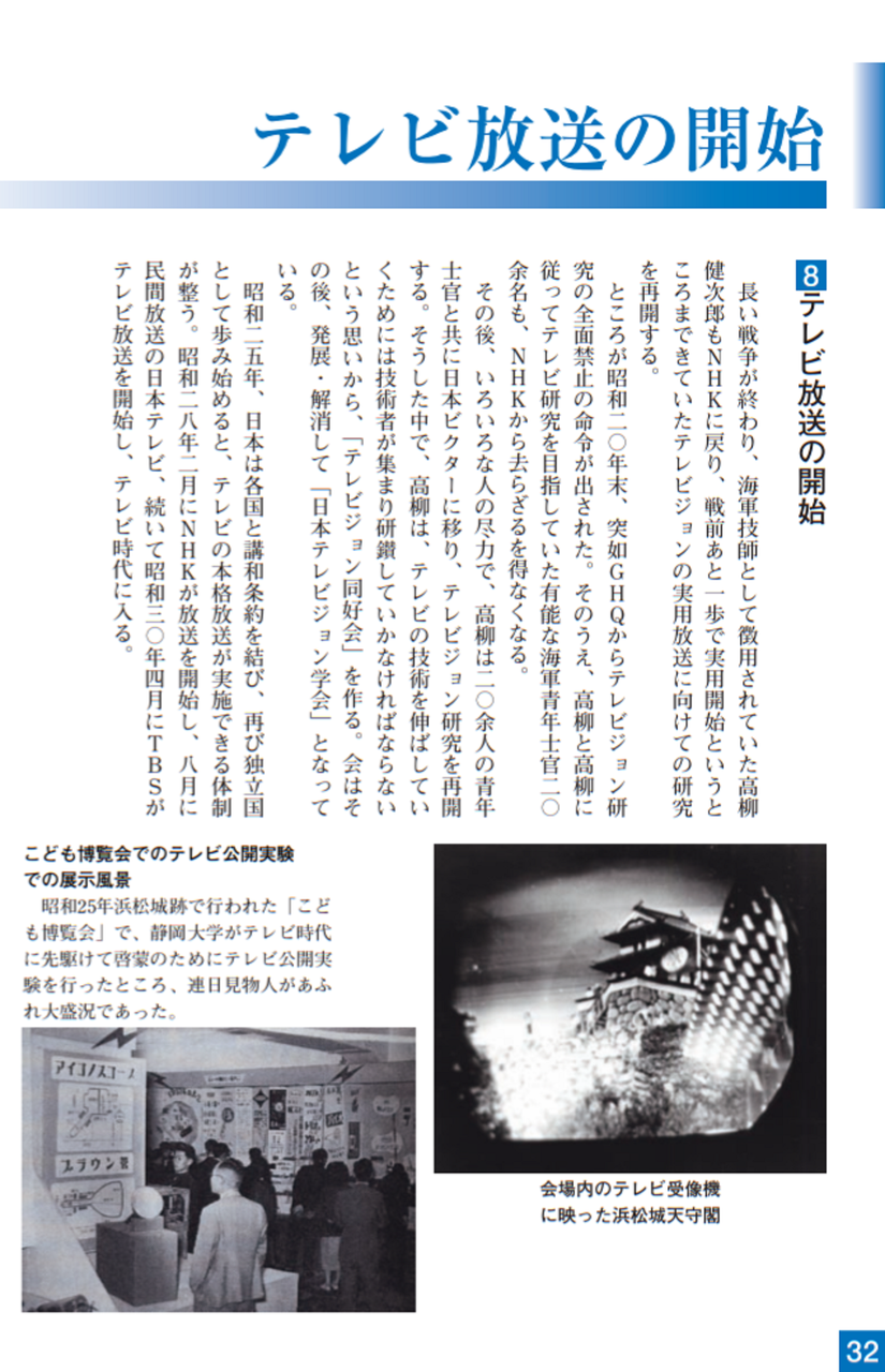 戦後、高柳はテレビジョンの研究を進めるために、日本ビクター(株)に入社し、テレビジョンの技術革新とテレビ放送の実用化に尽力しました。昭和24年(1949)にはテレビジョンの放送が始まり、昭和35年にはカラーテレビの放送も始まりました。この間、高柳は日本のテレビ開発、テレビ産業技術のリーダーとして活躍しました。