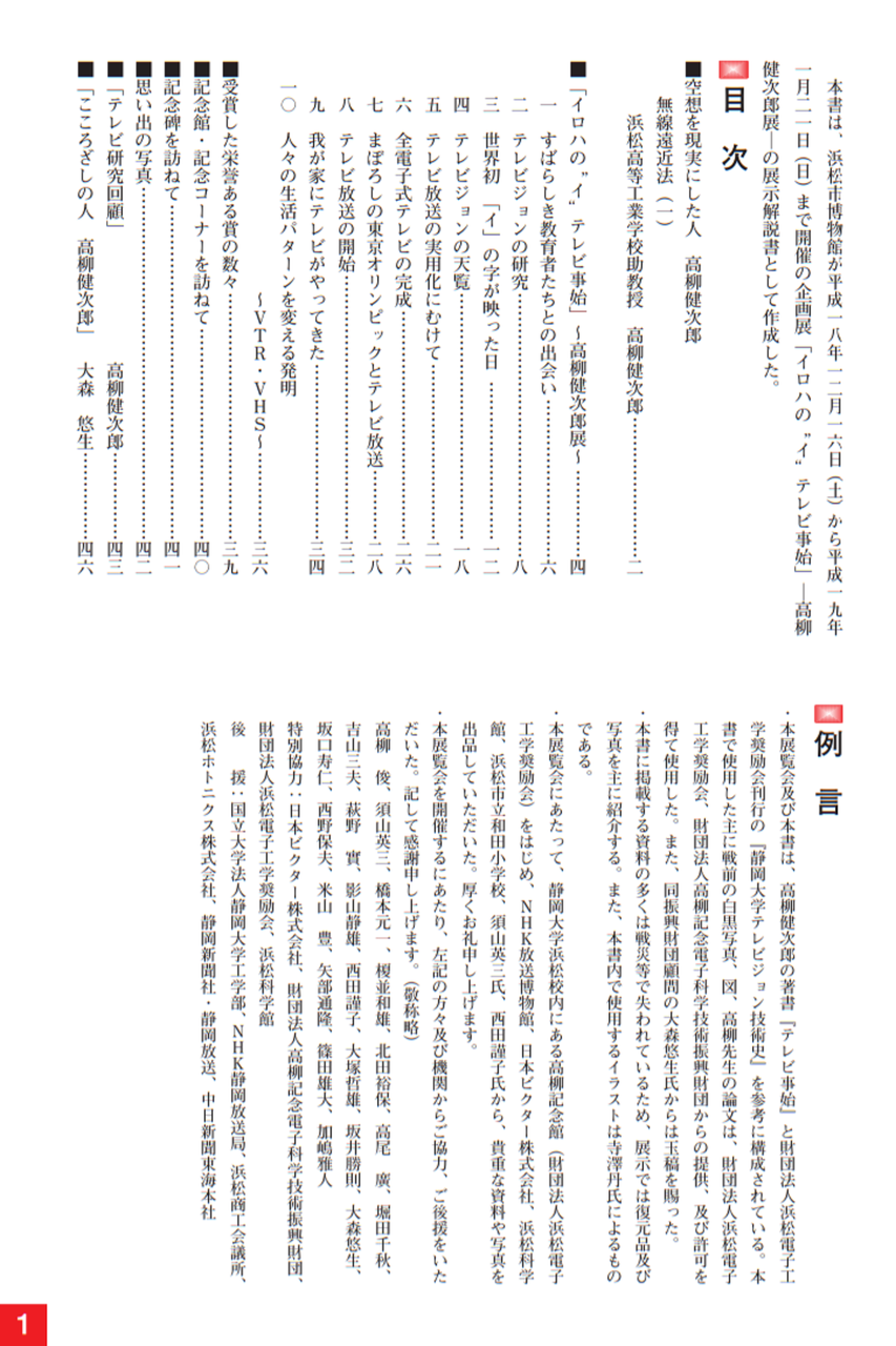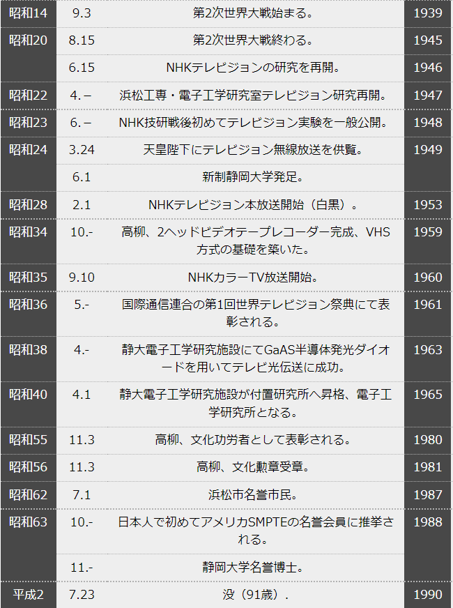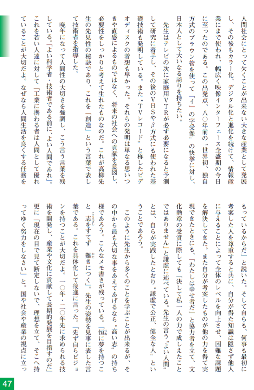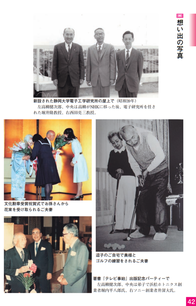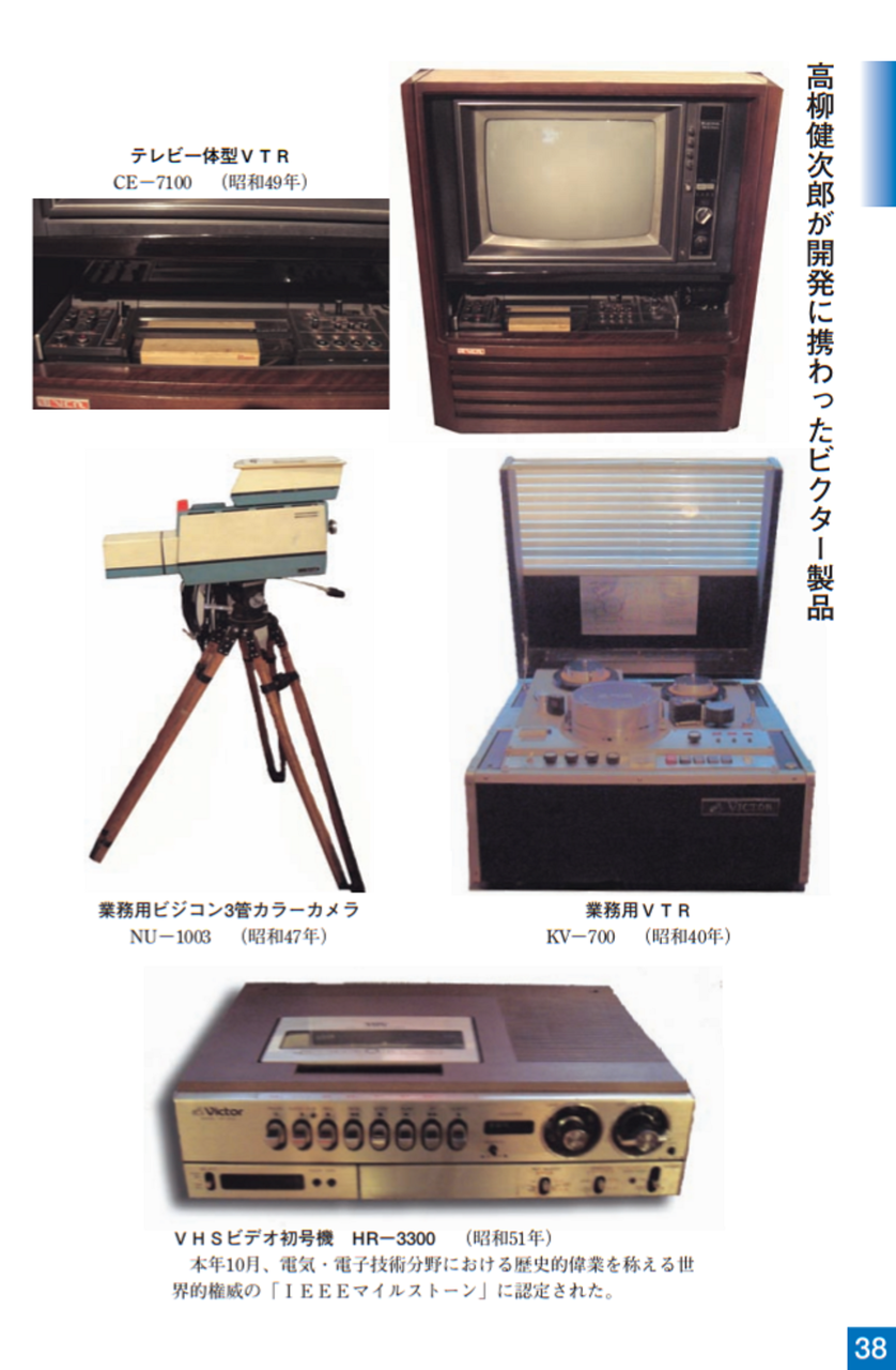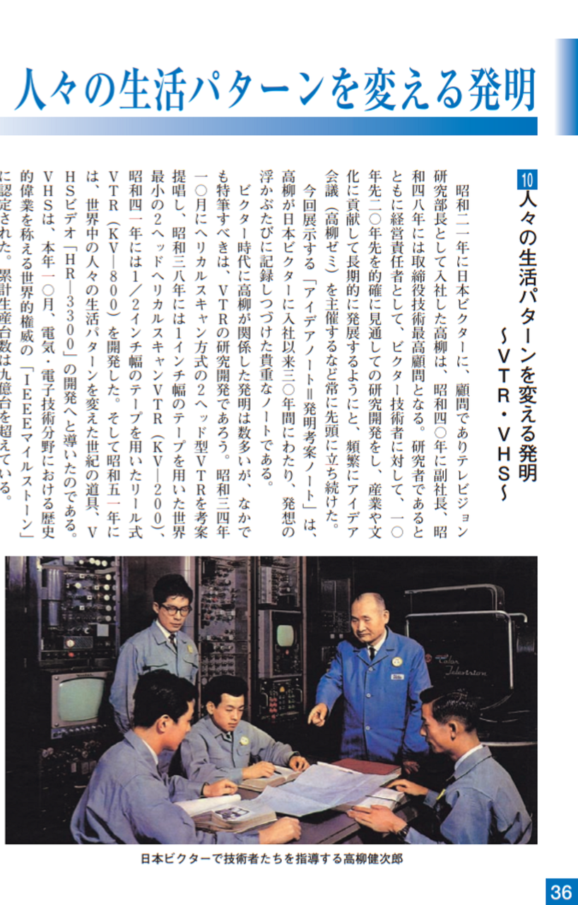 昭和34年(1959)には世界に先駆けて、2ヘッド方式のビデオテープレコーダーを完成させ、ホームビデオの世界的普及とVTR産業の発展に貢献しました。このように、高柳はテレビジョンに関する技術の礎を築き、さらに、大きなテレビ産業として発展する技術のリーダーとしての役割を果たしました。その結果、日本のテレビジョンの技術は世界で最も進んだものとなりました。