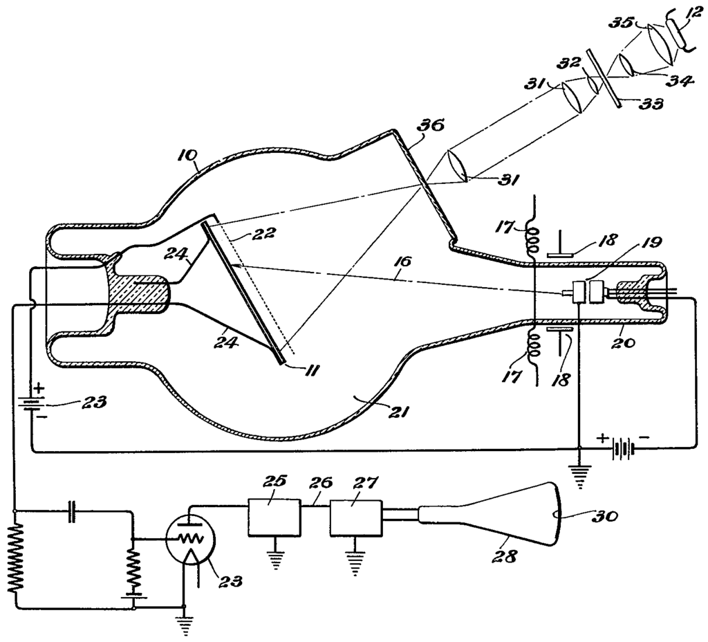 構造は右図のようになっており、図の右上からレンズを通って入射した画像は光電面に投影される。光量に応じ光電素子のモザイクに電荷が蓄積される。陰極線が光電面を走査すると電荷が放電し、図の左から増幅器へ画素の明るさに応じた電流が流れる仕組みになっている。