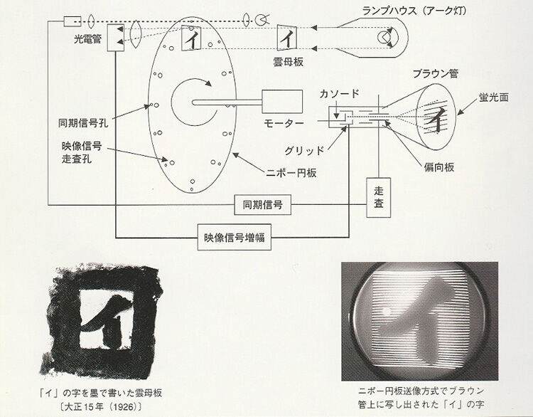 大正天皇が崩御した1926年12月25日、高柳はブラウン管による電送・受像に世界で初めて成功した[1]。送像側にニプコー円板を、受像側にブラウン管を用いて、片仮名の「イ」の文字を送受像した[1]。走査線の数は40本だった。「イ」の文字はいろは順の最初の文字として選んだ。