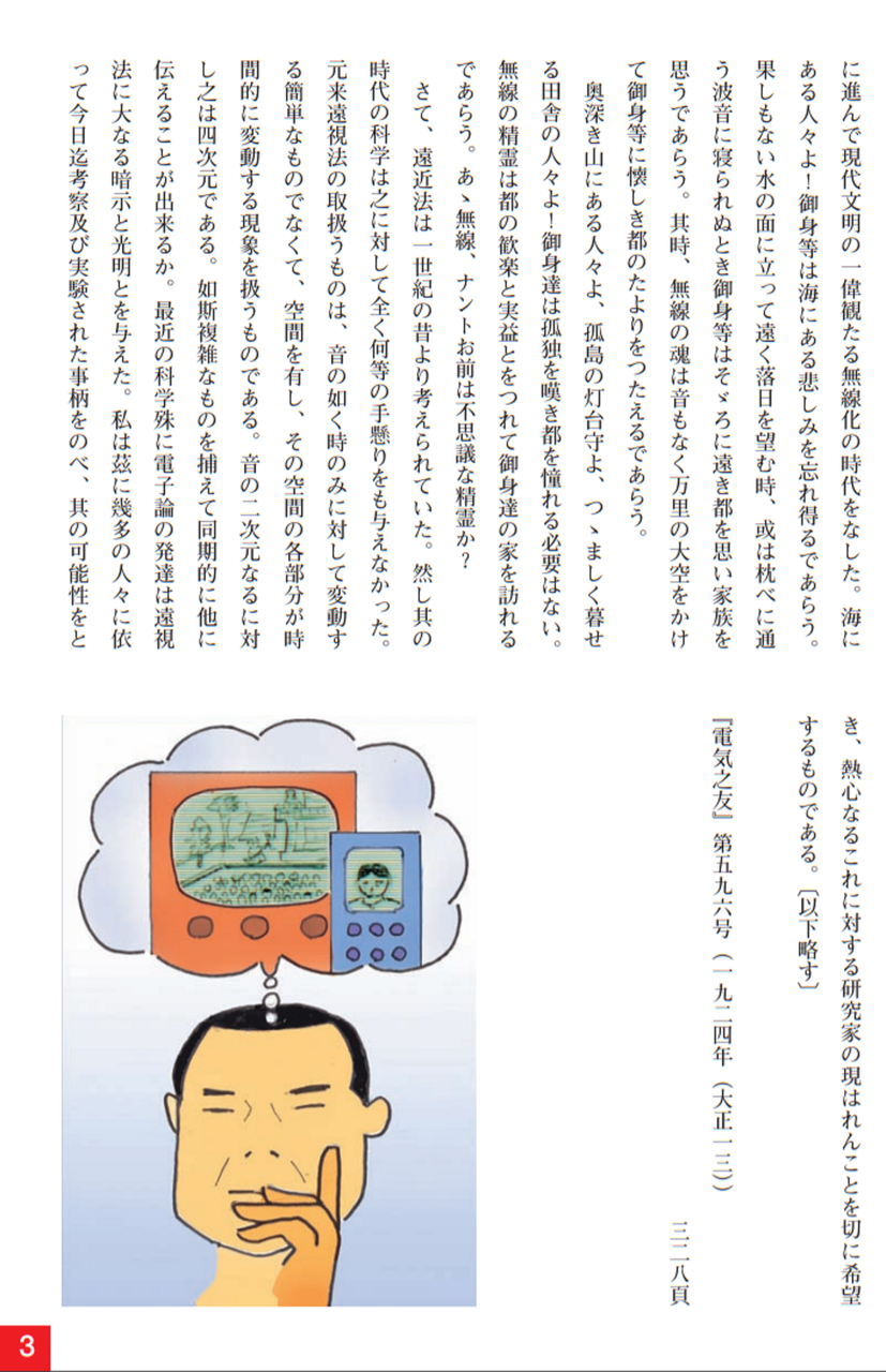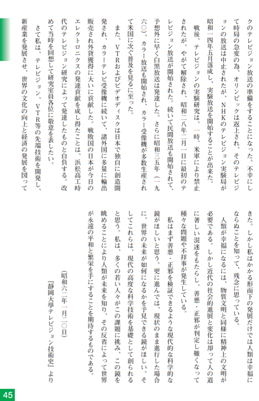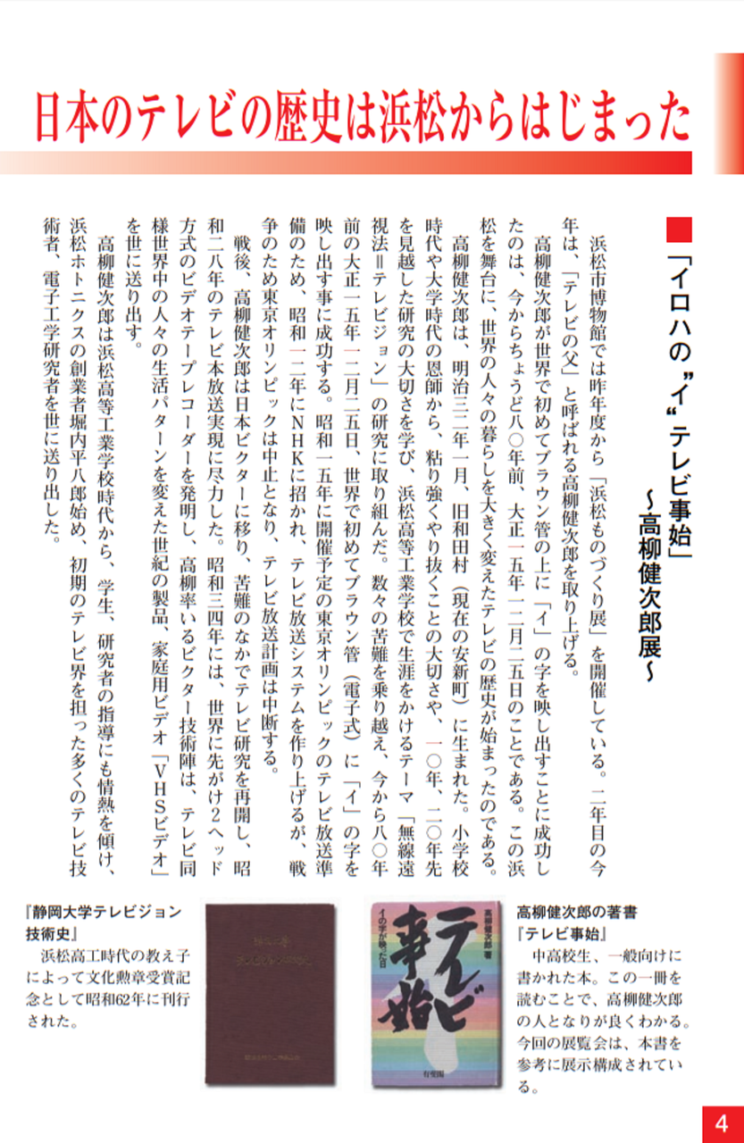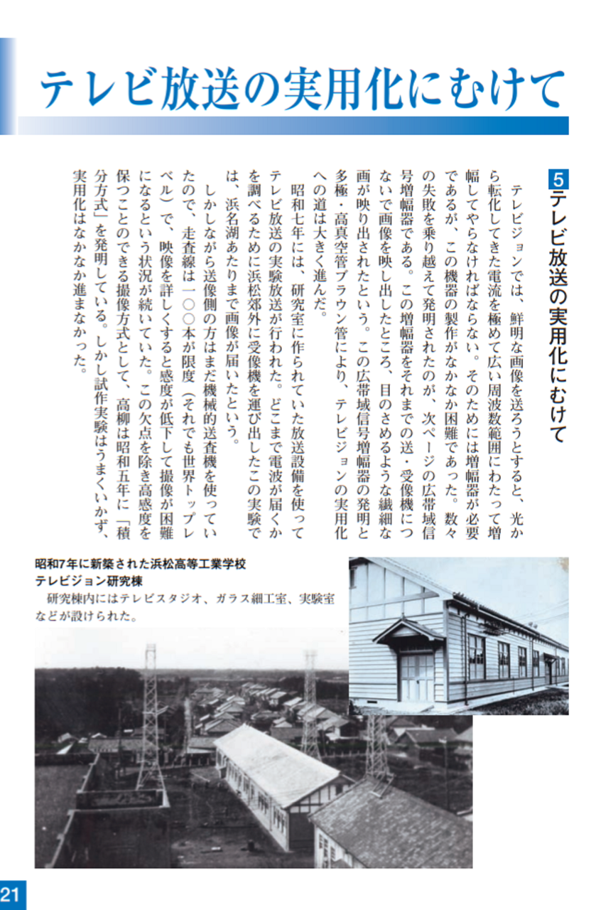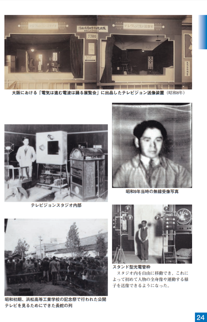 大正13年、浜松に新設された浜松高等工業学校(現:静岡大学工学部)の助教授として迎えられ、かねてよリ考えていたテレビジョンの研究をしたい、という希望を校長に申し出て、ここで「無線遠視法」(現:テレビジョン)の研究を始めました。当時ラジオ放送も未だ一般的には普及していない頃で、普通の人には想像もつかないものでした。