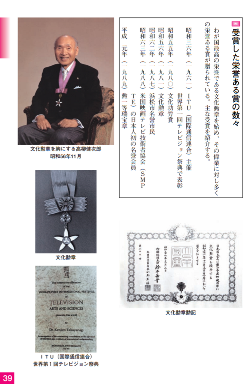 こうした功績により、昭和56年(1981)文化勲章を受賞、昭和62年浜松市名誉市民に推挙され、昭和63年日本人では初めてアメリカSMPTE(映画テレビ技術者協会)の名誉会員に選ばれました。平成元年(1989)勲一等瑞宝章を授与されました。