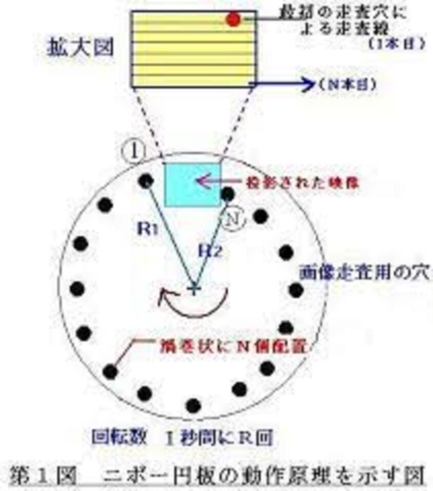 図において、墨で「イ」の字を書いた雲母版をニポー円板の直前に置き、ランプハウスから照明をあてるとき、ニポー円板には渦巻状に小さい穴が開いており、穴を通過した光は、ニポー円板の後ろに置いた光電管に光が入り電気信号を発生する。雲母版の墨の部分は光が透過せずに信号は無くなる。ニポー円板が回転すると「イ」の字を線状に走査することになり、電気信号が得られる。これを、増幅し電気信号として伝送し、受像機側でブラウン管の電子ビームを強弱して変調し、ニポー円板と同じようにブラウン管の電子ビームを走査すれば、ブラウン管上に「イ」の字が再現される。