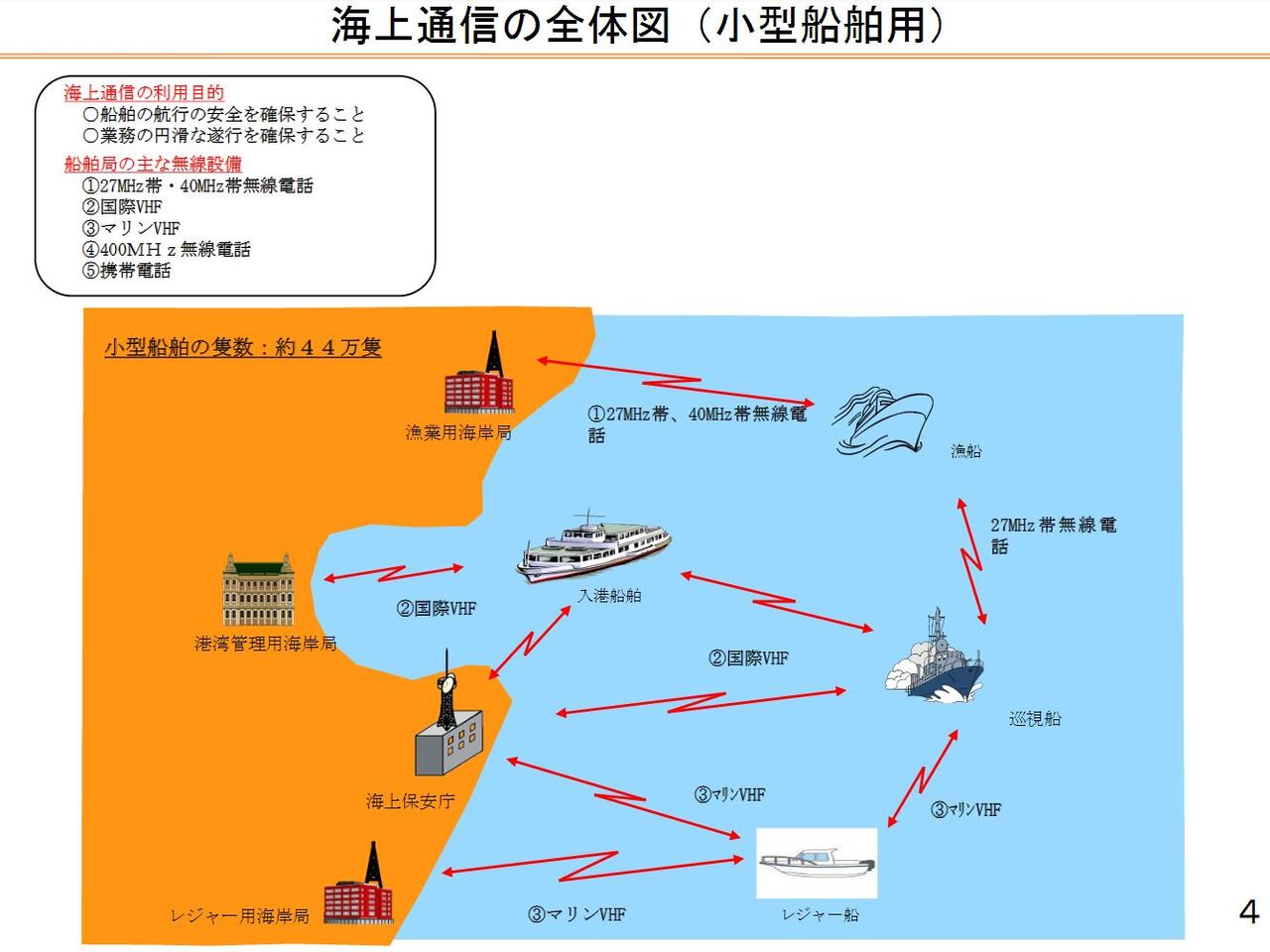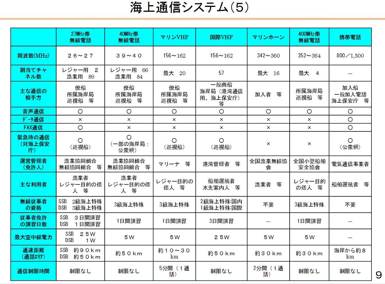 漁業用海岸局. レジャー用海岸局. 港湾管理用海岸局. 入港船舶. 漁船. レジャー船. ②国際VHF. ①27MHz帯、40MHz帯無線電. 話. ③マリンVHF. 巡視船. ③マリンVHF. ②国際VHF. 27MHz帯無線電. 話. 海上保安庁.など・・