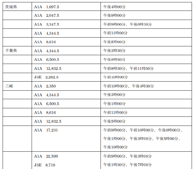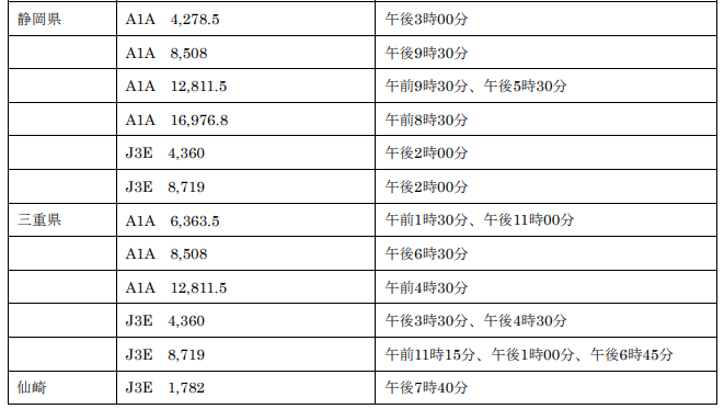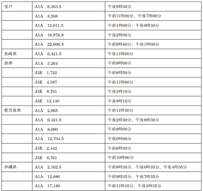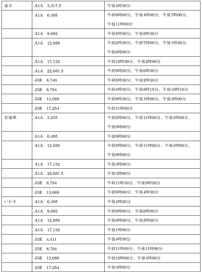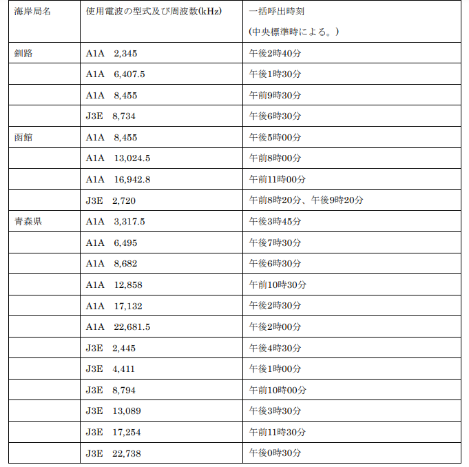 電気通信業務用海岸局(一括呼出を行う時刻及び電波). 漁業用の海岸局. 海岸局名. 使用電波の型式及び周波数(kHz). 一括呼出時刻. (中央標準時による)