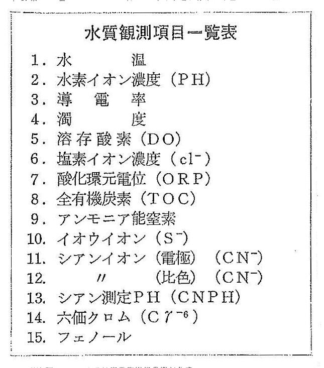 当社が初めて受注した公害テレメータであり、世界で初めて導入された水質常時監視システムの水質テレメータです。これは観測局を河川沿いに11局設置し、中央制御局において遠隔操作するシステムです。伝送路は専用の有線で、河川水質は15項目を観測。各観測局は無人であり、監視局にはコンピュータを置いて日報、月報の作成などデータ処理が行われました。