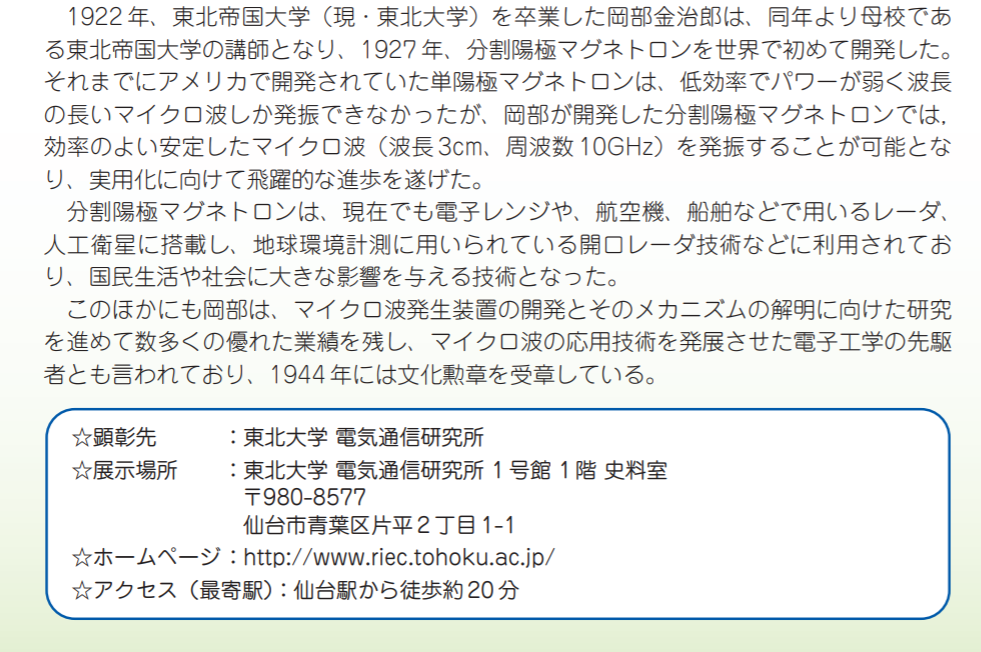 1927年東北帝国大学の岡部金治郎により「分割陽極型マグネトロン」が開発されて国内で発表された。これによりマイクロ波の発振が可能になった。1928年にはアメリカの学会で八木アンテナと共に英文の論文も発表された。