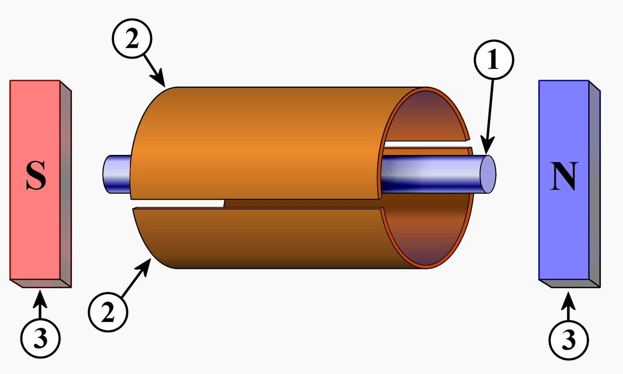 陰極は管球の空胴の中央に配置され、陽極はこの陰極を囲むように配置されるとともに、陰極に対して正の高電圧が印加されている。陰極をヒーターで加熱すると熱電子が放出され、陽極と陰極間の電界により陽極方向へ加速される。このとき、管球の軸方向に永久磁石などで強力な磁場が形成されており、電子はフレミングの法則に従い進行方向と直角な方向に力を受けて曲げられる。