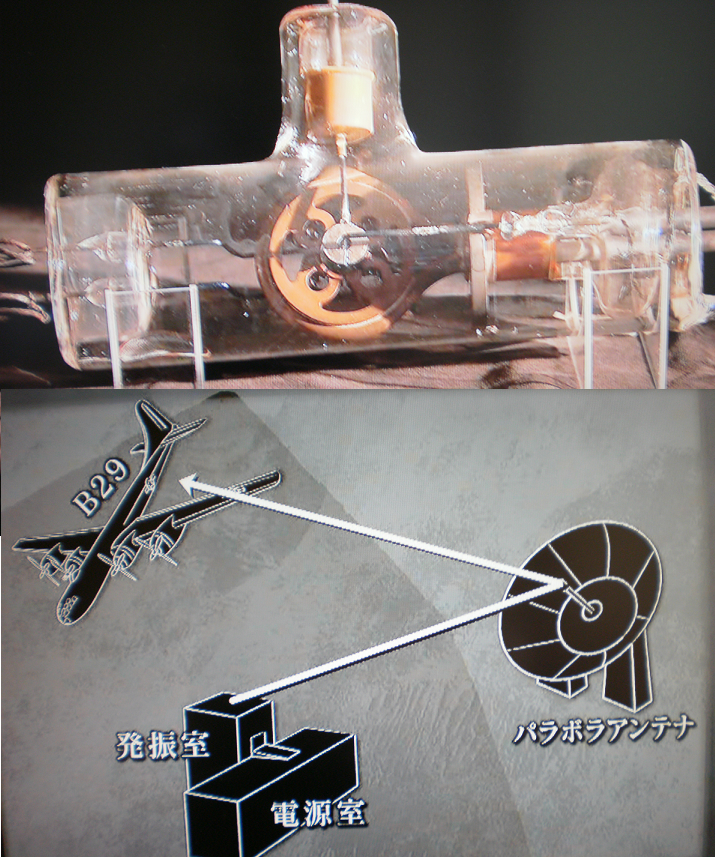本体である島田実験所では、電子レンジに応用されている「マグネトロン」で強力な電磁波を発生させる研究が進んでいました。この電磁波をパラボラアンテナから発信、1万メートル上空のB29に当てて、エンジンをスパークさせるものです。陸軍の研究と似ていますが、海軍は「Z研究」「Z装置」と呼び、朝永振一郎や湯川秀樹など後のノーベル賞学者も参加する中で開発が進みました。